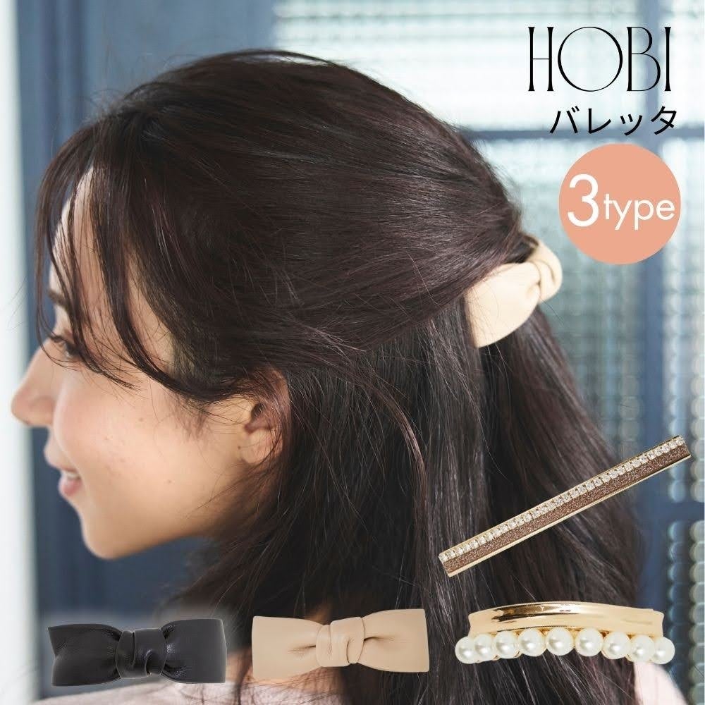 ラインストーンとラメが華やかなロングバレッタ、レザー調で甘くなりすぎず大人可愛いリボンバレッタ、日常使いからパーティーまで大活躍のパールバレッタの3タイプからお選びいただけます。