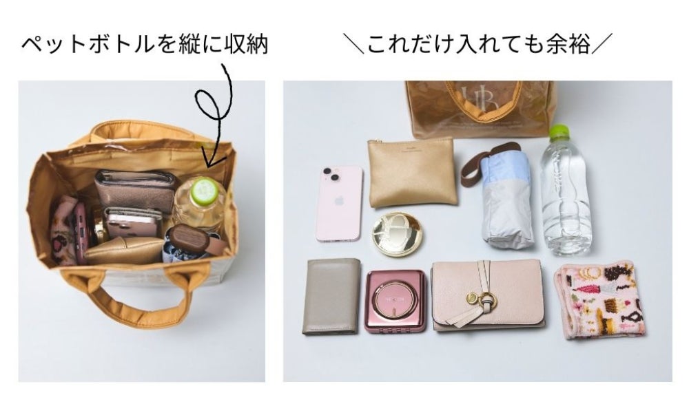 500mlペットボトルが縦に入るサイズ感で軽量なので、サブバッグやお買い物バッグとしてもおすすめです。