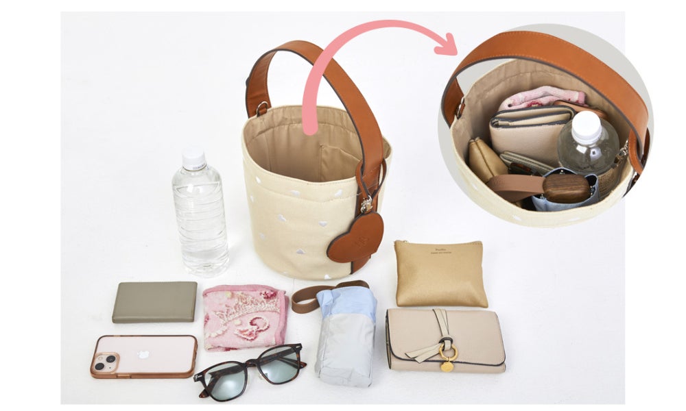 ハート柄刺繍とハート型のチャームがかわいいキャンバス地のバッグ。バケツ型のフォルムで収納力も高く、取り外し可能なショルダーや、小物の収納に便利なポケットが2つ付いた、かわいいだけではなく機能性も兼ね備えたバッグです。