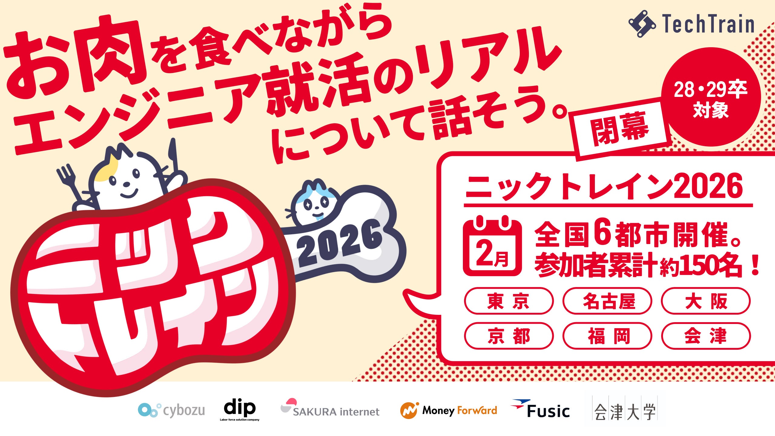 「テクノロジーを支える、全ての人のターミナルに。」を掲げるTechTrain(株式会社TechBowl 本社:東京都千代田区、代表取締役社長:小澤 政生、以下「TechTrain」)は、エンジニアを目指す学生向けキャリアイベント「ニックトレイン」を東京・会津・名古屋・京都・大阪・福岡の全国6都市で開催いたしました。本イベントには総勢約150名の学生が参加。全国の国公立・私立大学や高等専門学校など、複数の教育機関から学生が集まり、地域や専攻を超えた横断的な交流が生まれました。各地の企業・大学と連携し、プロダクトで価値を生み出せる人材の育成をテーマに、キャリア形成とスキル向上を支援する機会を提供しました。
