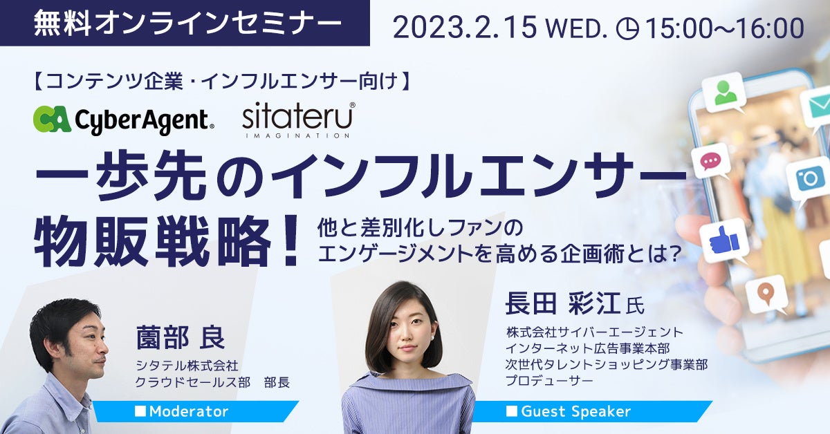 衣服・ライフスタイル産業が抱える社会課題を解決するクラウドサービス「sitateru CLOUD」を提供するシタテル株式会社(本社:熊本県熊本市、代表取締役:河野秀和、以下シタテル)は、コンテンツ企業・インフルエンサー向けに、『一歩先のインフルエンサー物販戦略!他と差別化しファンのエンゲージメントを高める企画術とは?』と題し、無料オンラインセミナーを2月15日(水)に開催いたします。