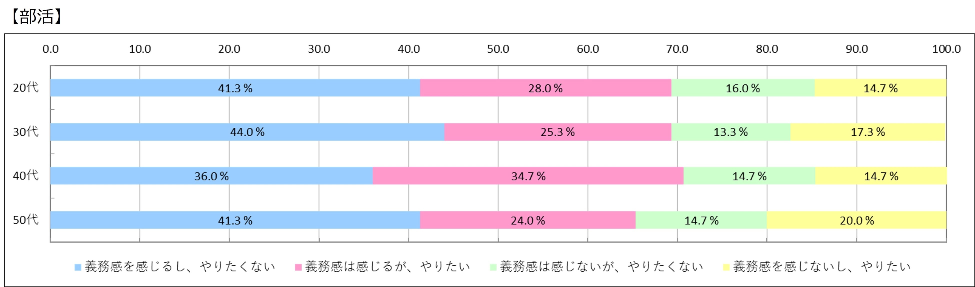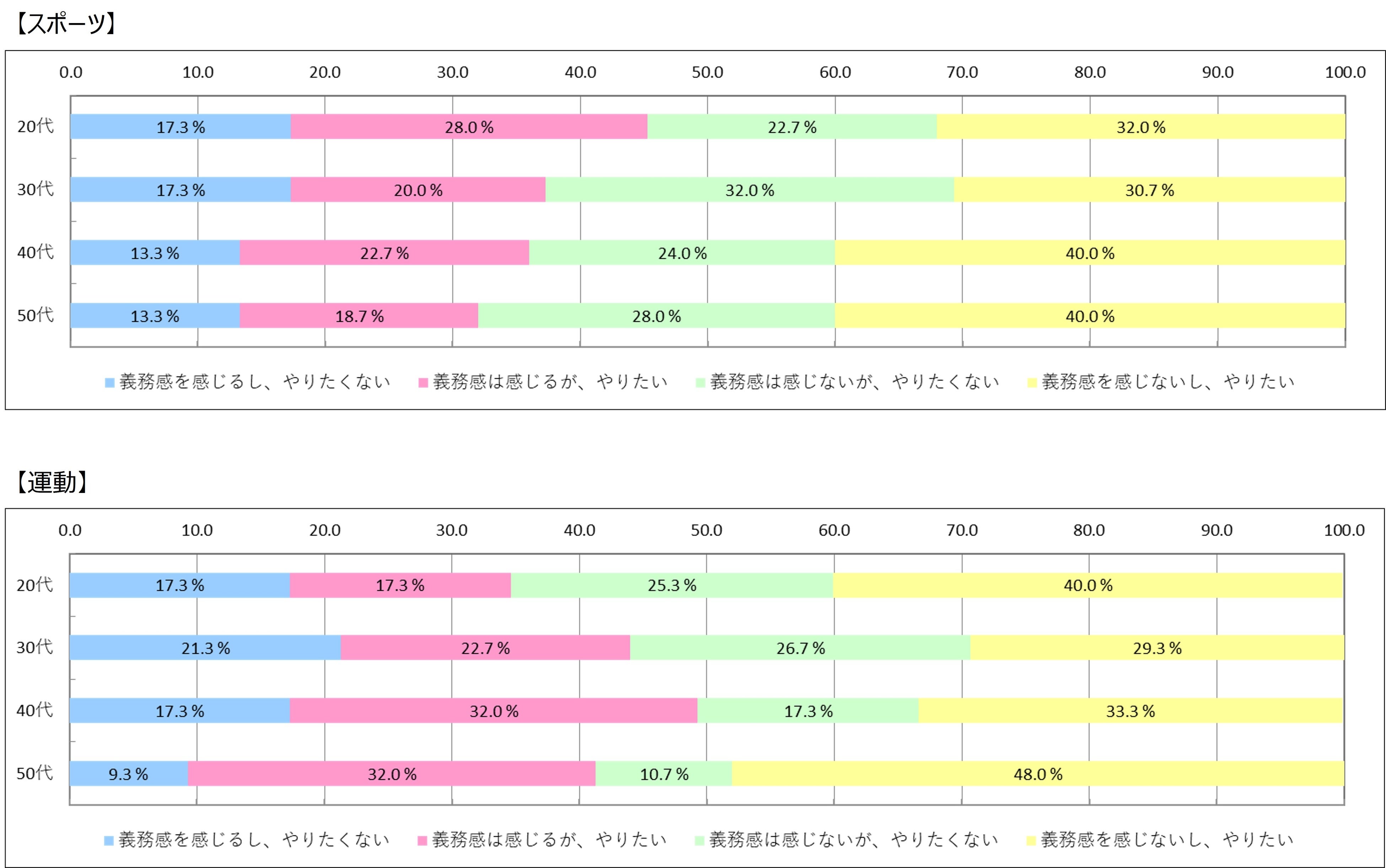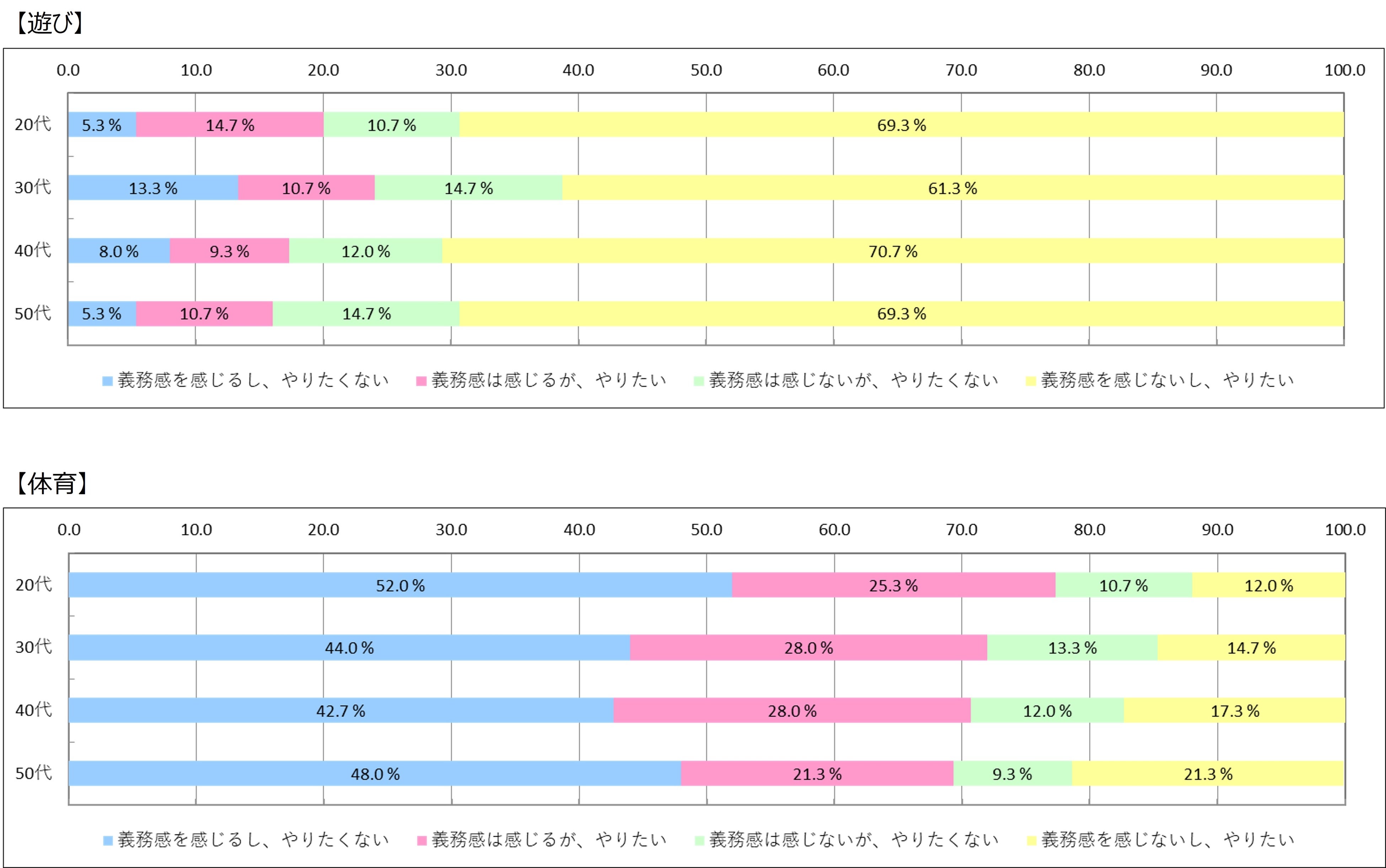 また、「スポーツ」「運動」「体育」「部活」「遊び」の5つの言葉に対して、各々への「義務感」と、「やりたい」と思うかについて回答を求めたところ、「体育(46.7%)」「部活(40.7%)」においては、40%以上が「義務感」を感じ、「やりたくない」という回答になりました。中でも体育については、20代の半数以上が該当しています。