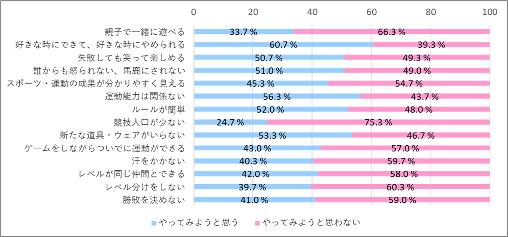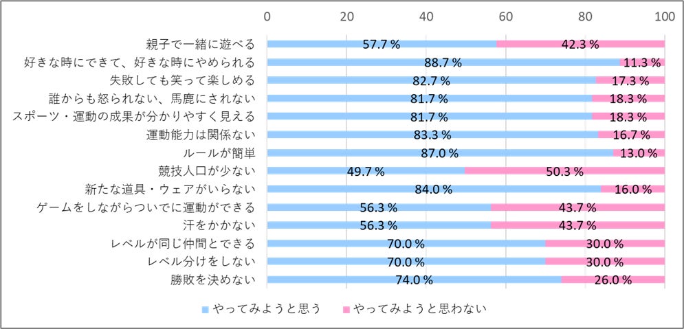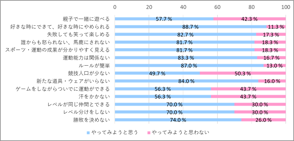 さらに、「好きな時にできて、好きな時にやめられる(88.7%)」「ルールが簡単(87.0%)」「新たな道具・ウェアがいらない(84.0%)」など、時間やかかる費用などによる制限や、取り組みやすいスポーツ・運動があればやってみようという回答が複数の項目で80%を上回る結果になりました。