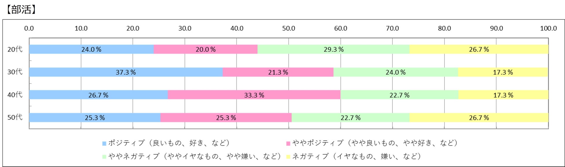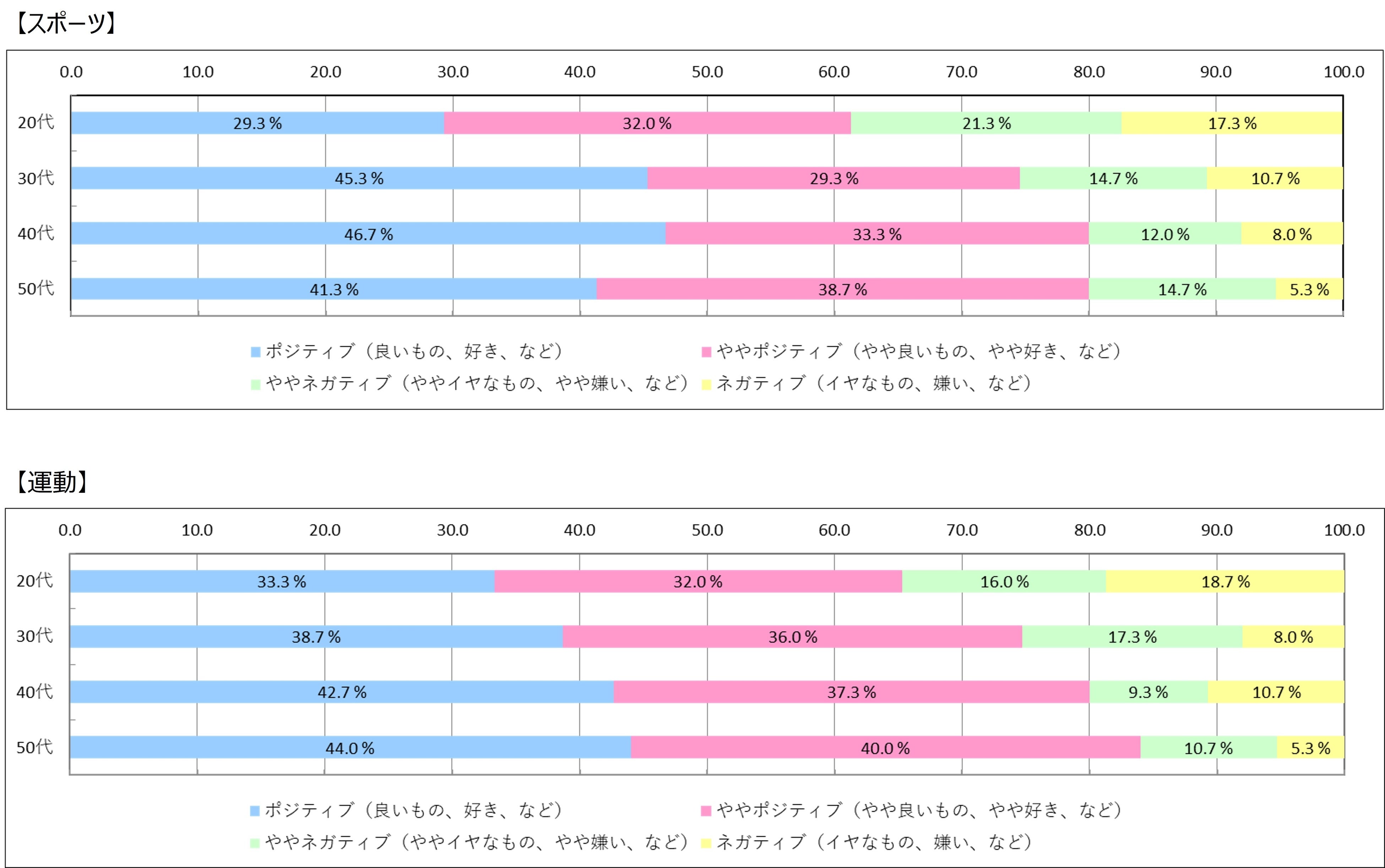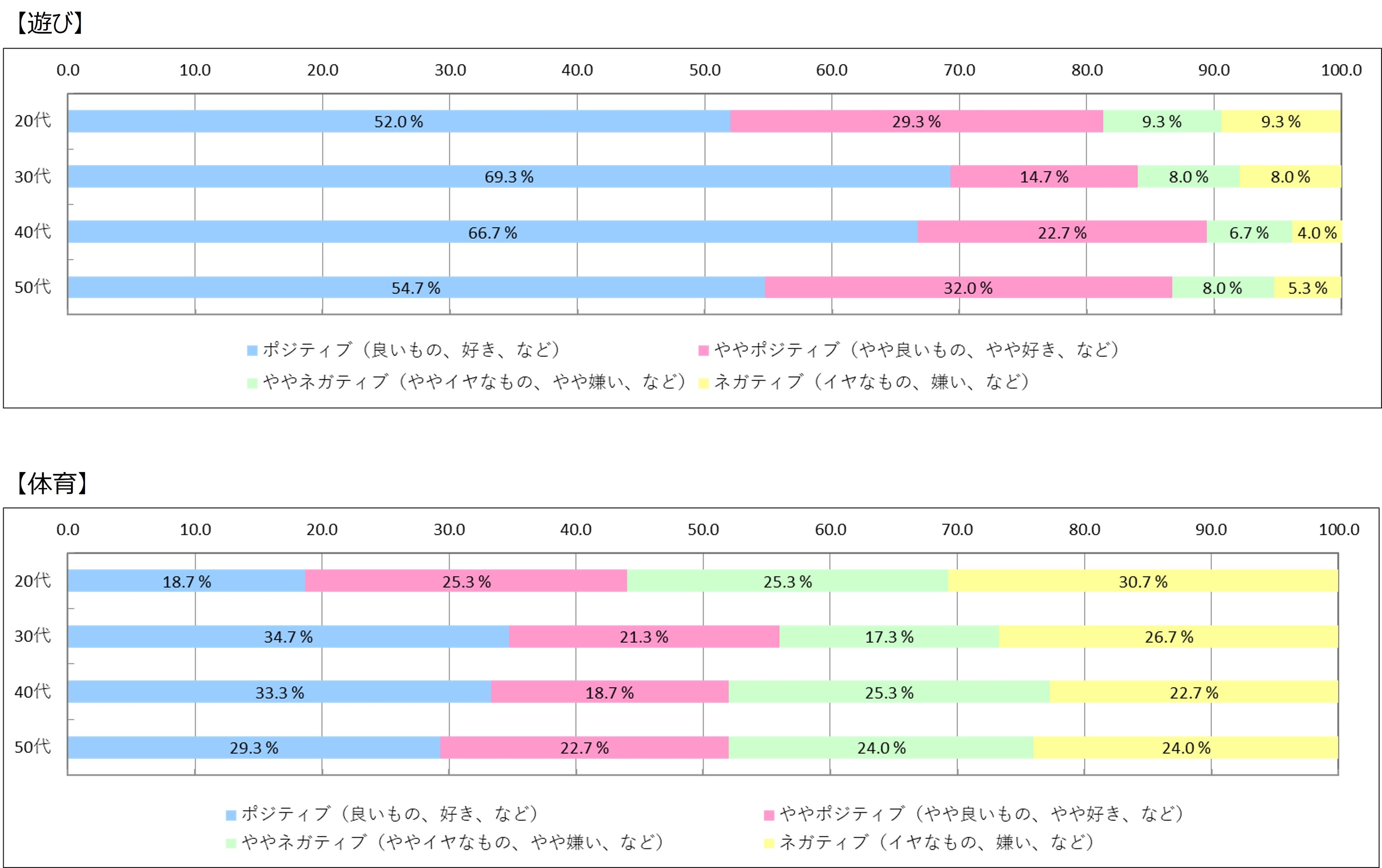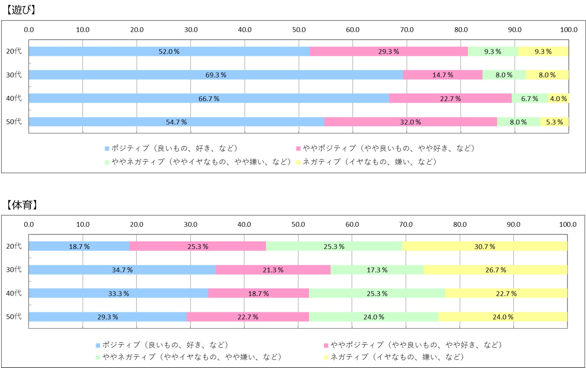 一方で、「体育(49.0%)」「部活(46.7%)」と、学校でのスポーツ・運動については、約半数がネガティブなイメージを持っており、特に20-30代にネガティブなイメージを持つ傾向が強くなっていました。