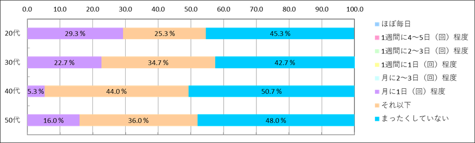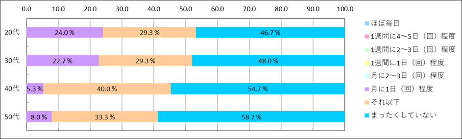 「意欲あり/低関与」の人に、新型コロナウイルス流行(2020年2月〜)前後における、スポーツ・運動(※2)の実施頻度について質問したところ、下記グラフのとおり顕著な変化は見られず、約半数が全くしていないと回答しました。(※2)スポーツ・運動とは、散歩や自転車での移動、自宅で行うストレッチなどの身体活動も含みます。