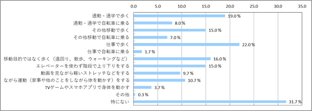 一方で、週1回以上かつ1日あたり合計30分以上(※1)、スポーツ・運動と同等と捉えられる身体活動を何もしていないと回答した人は31.7%でした。つまり、残りの約70%の人が何かしらの身体活動を行っていることが分かりました。また、このことから、日常で行っている散歩やながら運動などは、スポーツ・運動と思っていないことも分かりました。