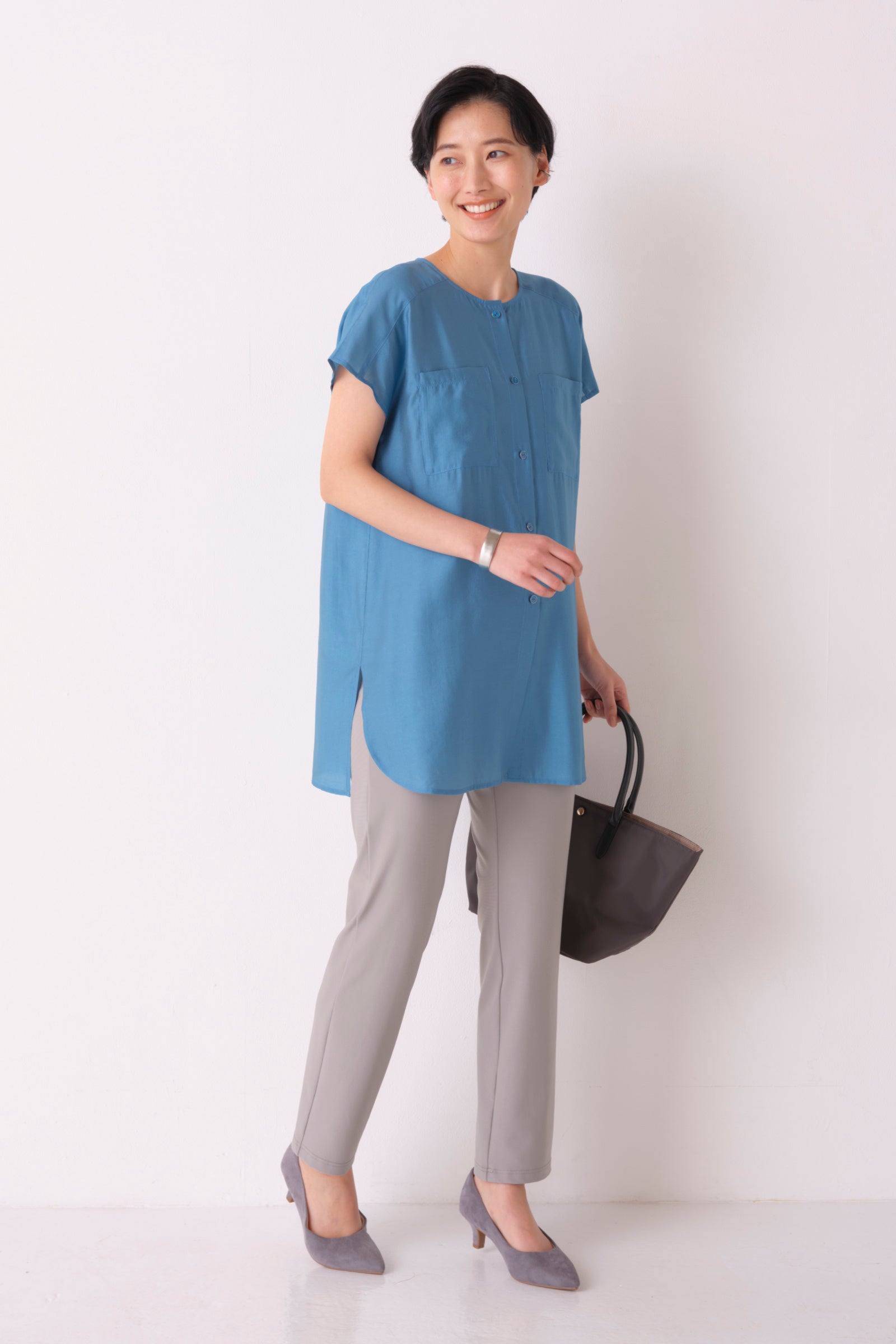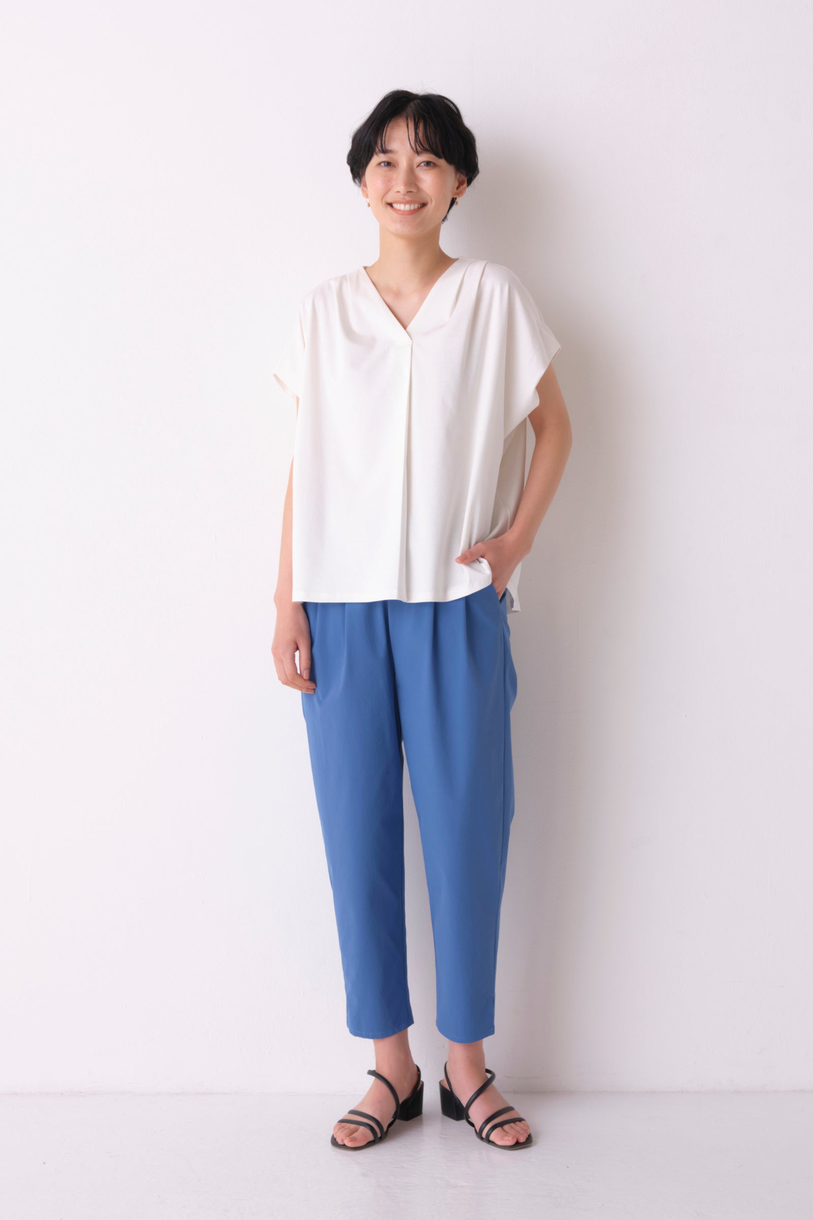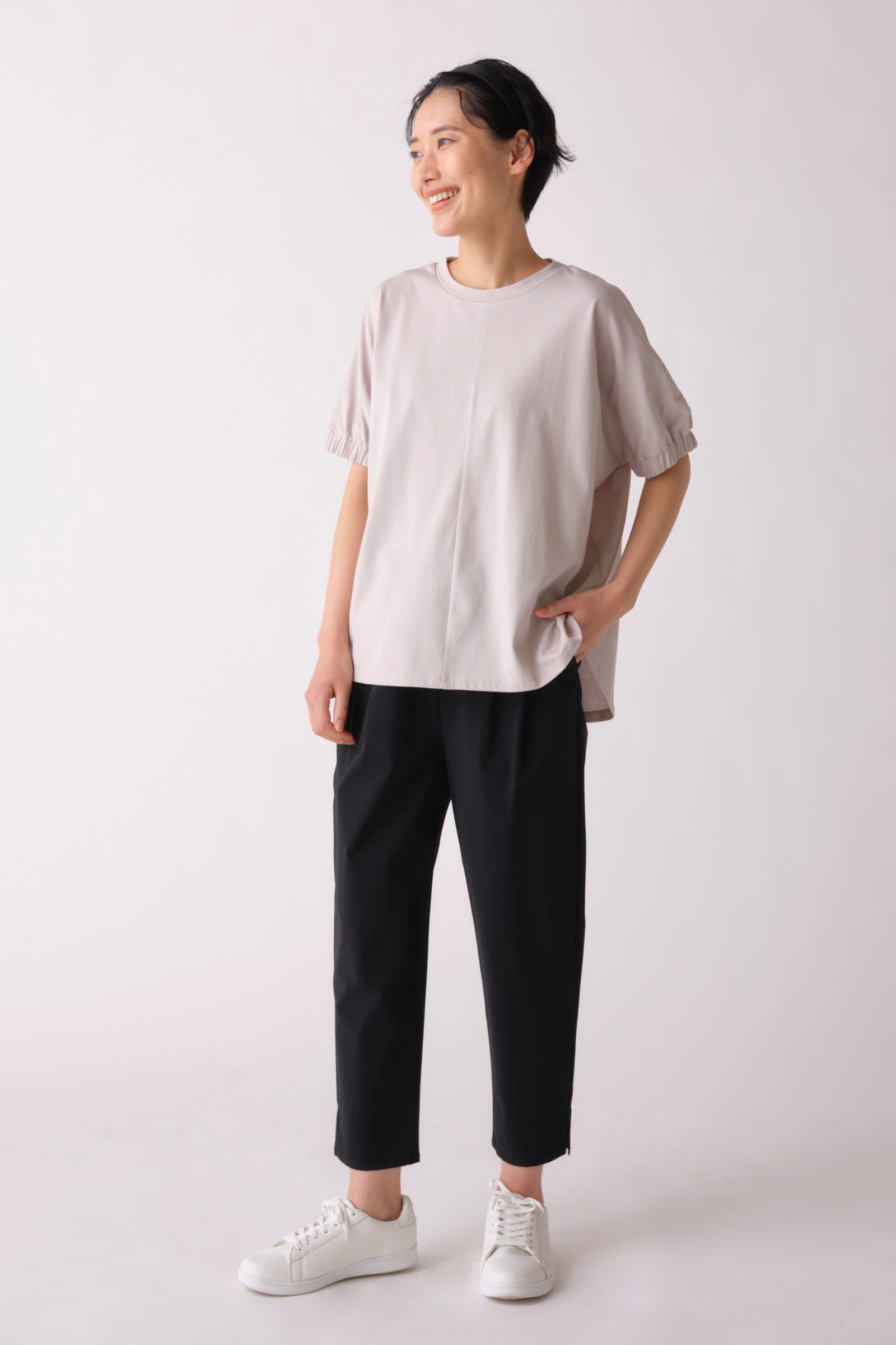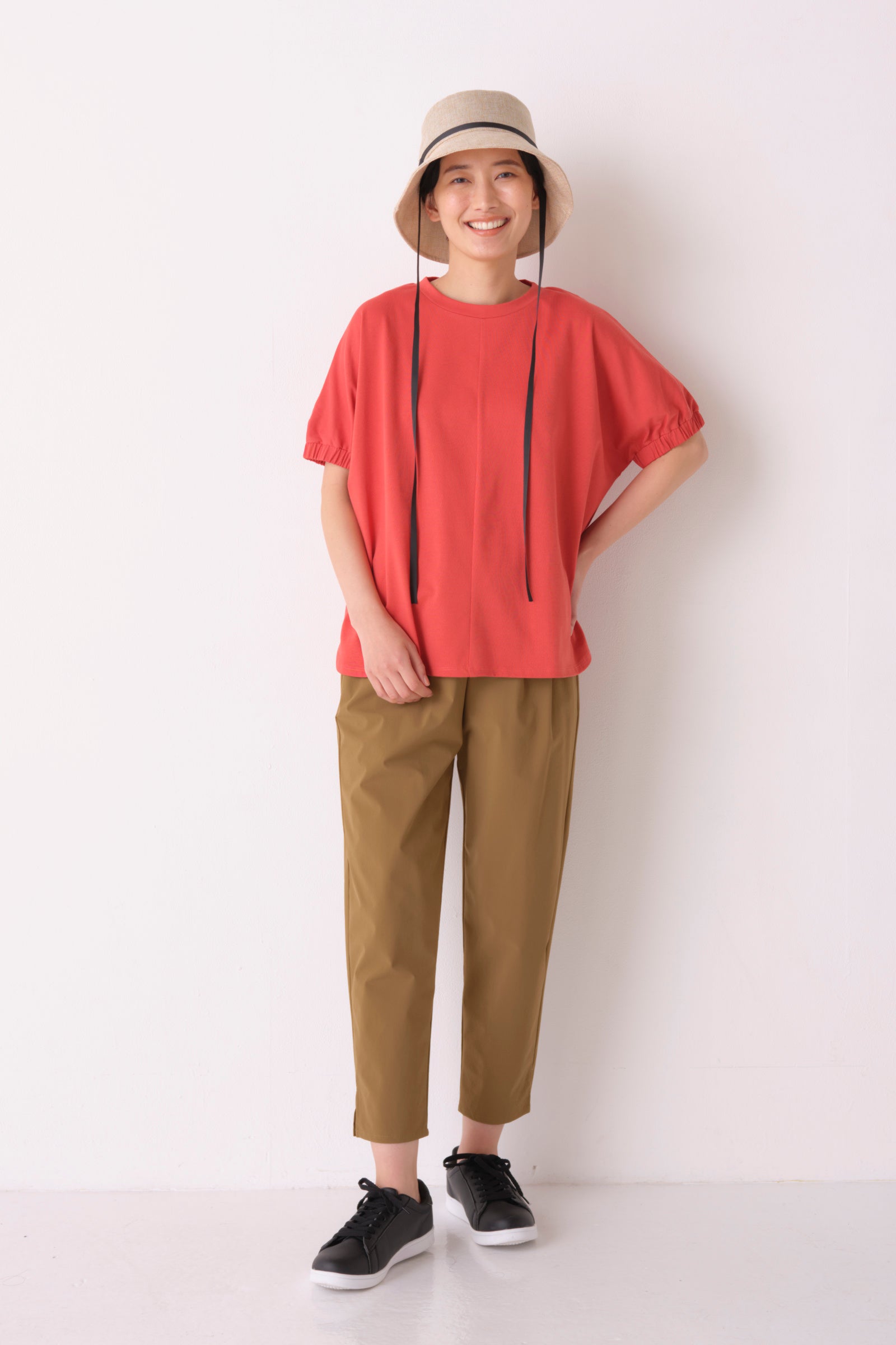 毎年人気の接触冷感パンツ。今年は撥水機能もついて、さらに日常使いに便利なアイテムになっています。ウエストギャザーが体型を拾いにくく、ウエストゴムで1日中快適なはき心地です。ストレッチが効いてシワになりにくく、オンもオフも天候も気にせず着まわしできます。洗濯機で洗えるイージーケアです。