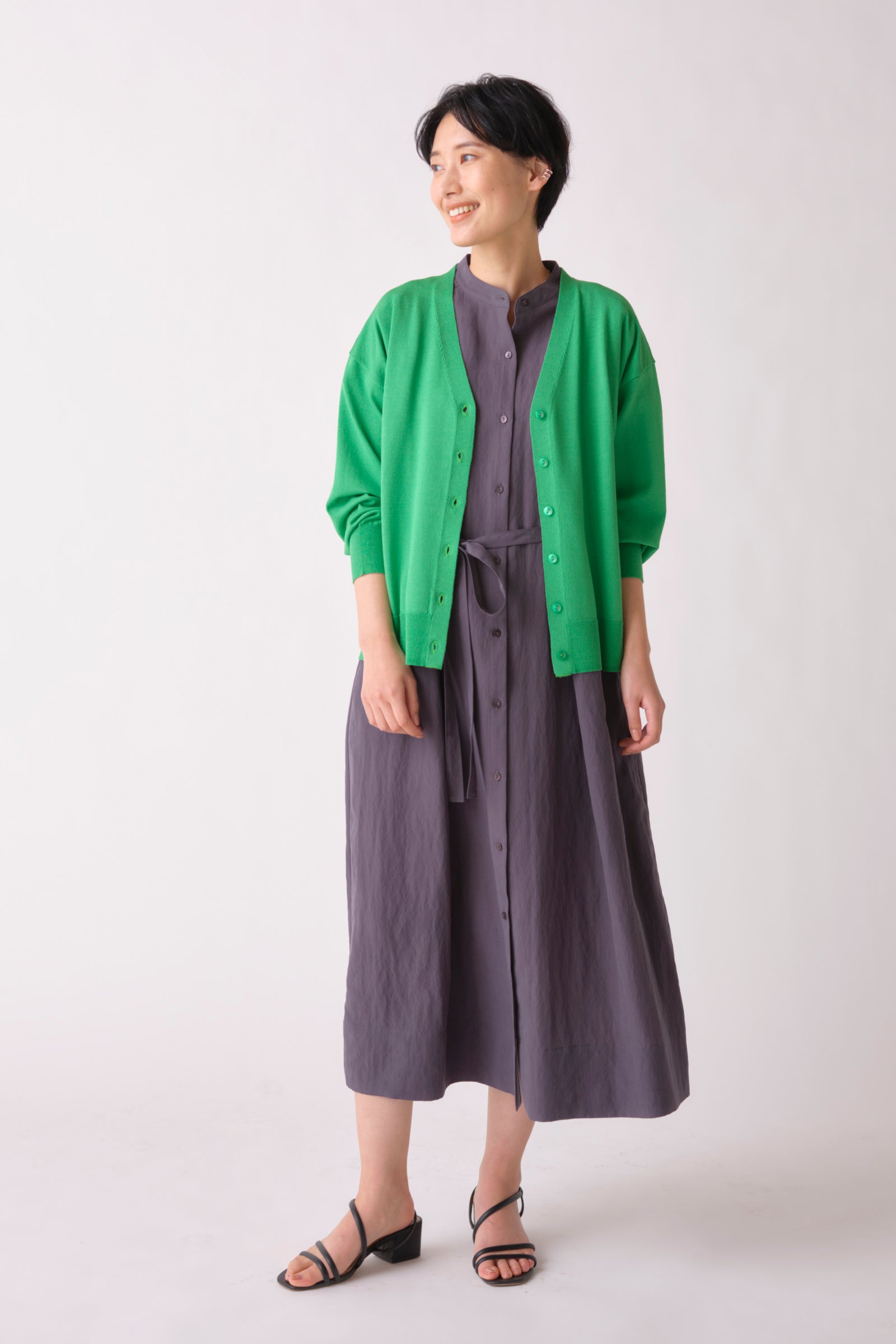 さらりとした肌ざわりが心地よい、接触冷感糸を使用したハーフ丈のニットカーディガン。Aラインシルエットに長めの着丈で、羽織るだけでエレガントなスタイルが完成します。取り外しのできる腰ひも付きで、ウエストマークした着こなしもおすすめです。自宅で洗えるイージーケアです。