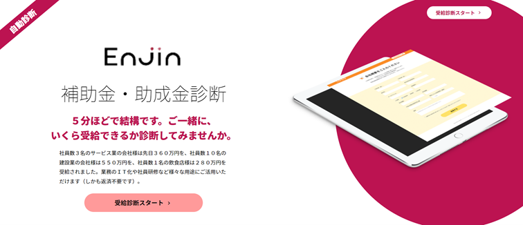 株式会社ライトアップ(本社:東京都渋谷区、代表取締役社長:白石崇、以下ライトアップ)は、株式会社Enjin(本社: 東京都中央区、代表取締役社長:本田 幸大、以下Enjin)と業務提携契約を締結し、ライトアップが提供する補助金・助成金自動診断システム「Jシステム」のOEM提供を開始いたしました。Jシステムの活用により、Enjinの取引先に、オンライン上でいち早く公的支援制度(補助金・助成金)の情報提供を行うことが可能となります。また、申請希望者はオンライン上で申請手続きのサポートを受けることが可能となります。