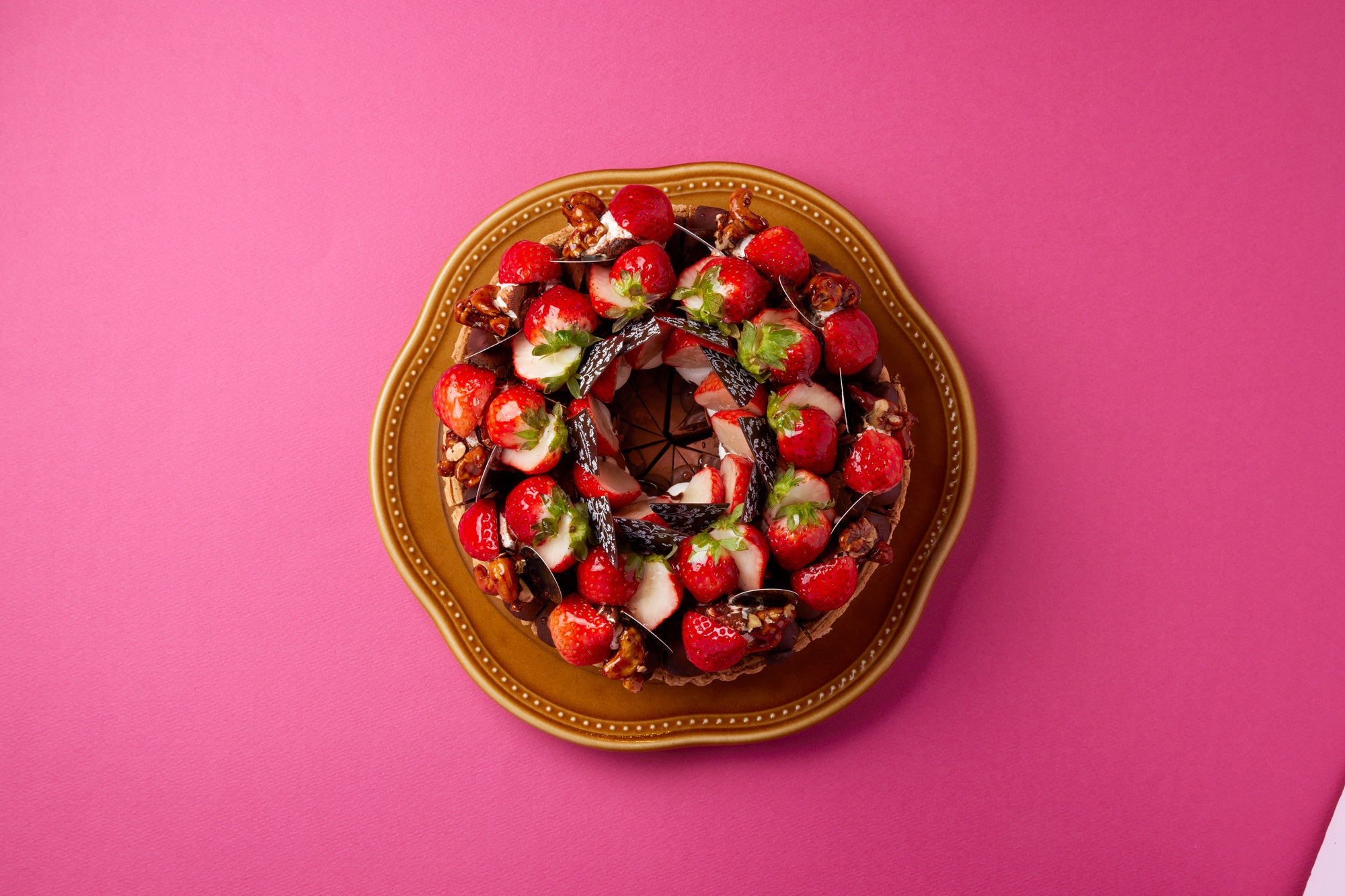 濃厚なのに甘すぎず軽やかな絶品ブラウニーに、コクのあるチョコカスタードクリームと香ばしいガナッシュクリームを閉じ込めて生チョコを絞った魅惑のタルト。たっぷりのった甘酸っぱいイチゴとキャラメルナッツ、バター香るパイタルト生地も絶妙なバランスで重なります。ご褒美スイーツに。