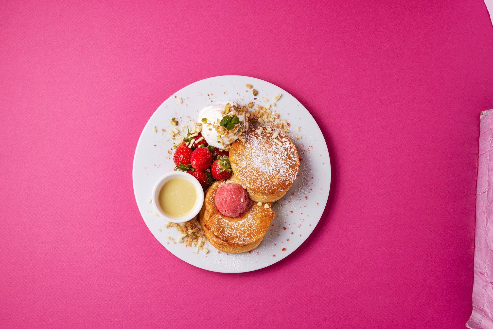 風味豊かな湘南小麦にマスカルポーネと自家製リコッタの2種のチーズ、しっかり立てたメレンゲを加えたシュワトロのパンケーキにうっとり。イチゴのジェラートとホイップクリーム、温かなホワイトチョコレートのソースとほおばって。敷き詰められたマカダミアナッツもおいしさの決め手。