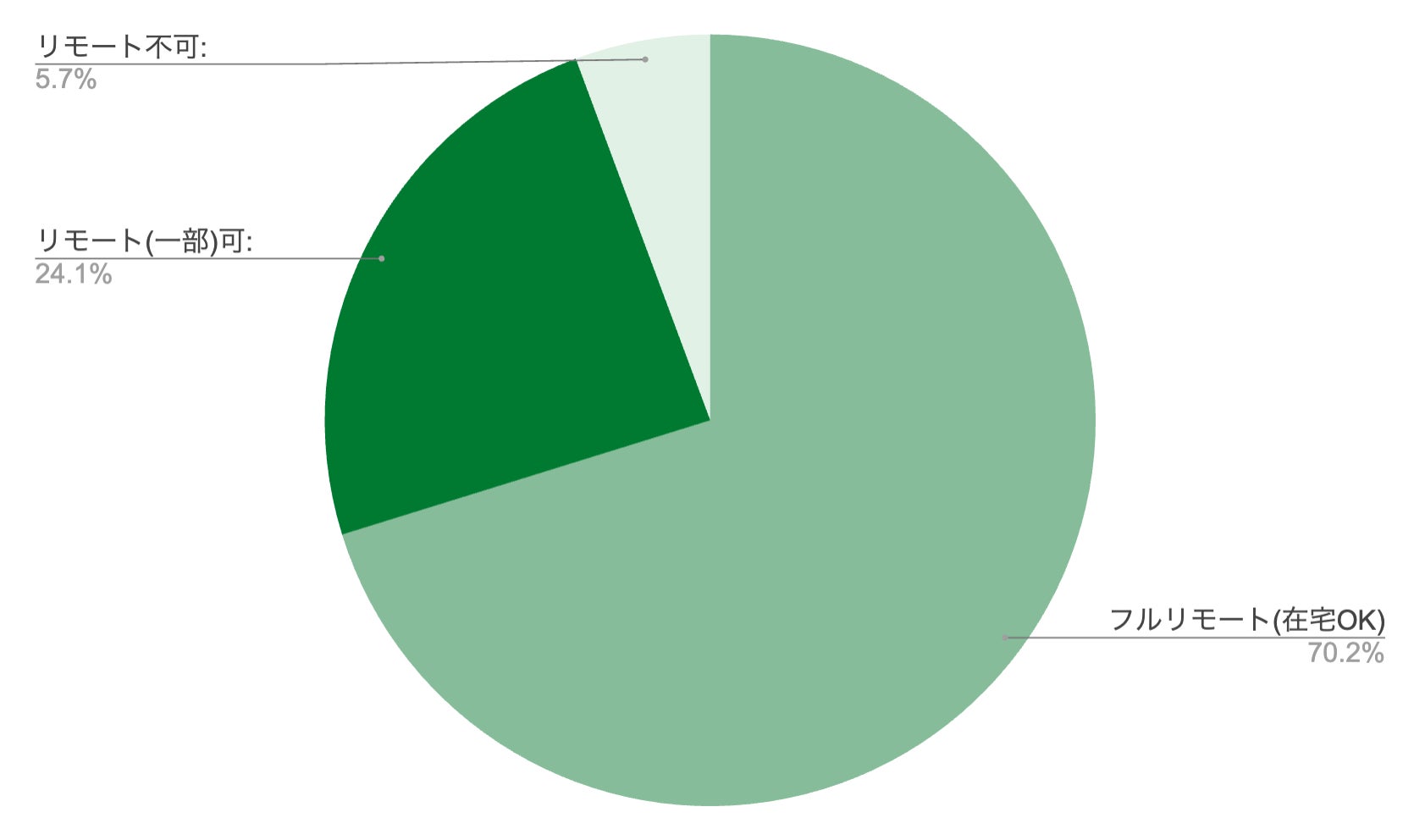 フルリモートが70.2%と圧倒的に高く、リモート一部可を合わせると94.3%がリモート対応可能です。戦略立案や市場分析、業務改革の提言など、成果物ベースの業務が中心となるため、場所を選ばず高度な専門性を発揮できます。経営層との重要な意思決定ミーティングやワークショップなど、対面が効果的な場面もありますが、全体としてはオンラインで完結するケースが多い状況です。リモート不可は5.7%と極めて少なく、全国どこからでも、時には海外からでも最高水準のコンサルティングサービスを提供できる環境が整っています。