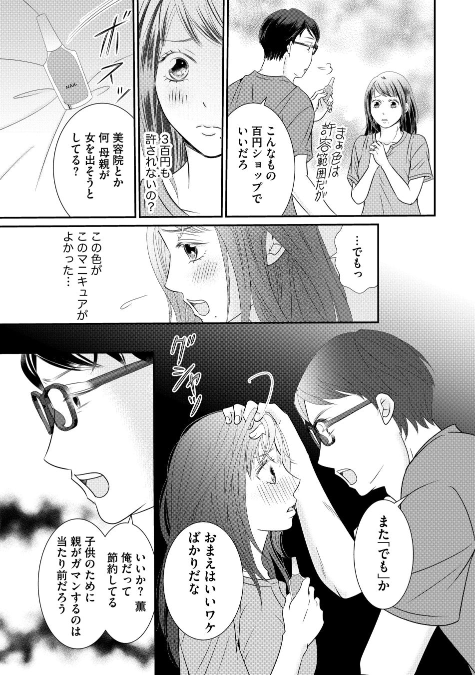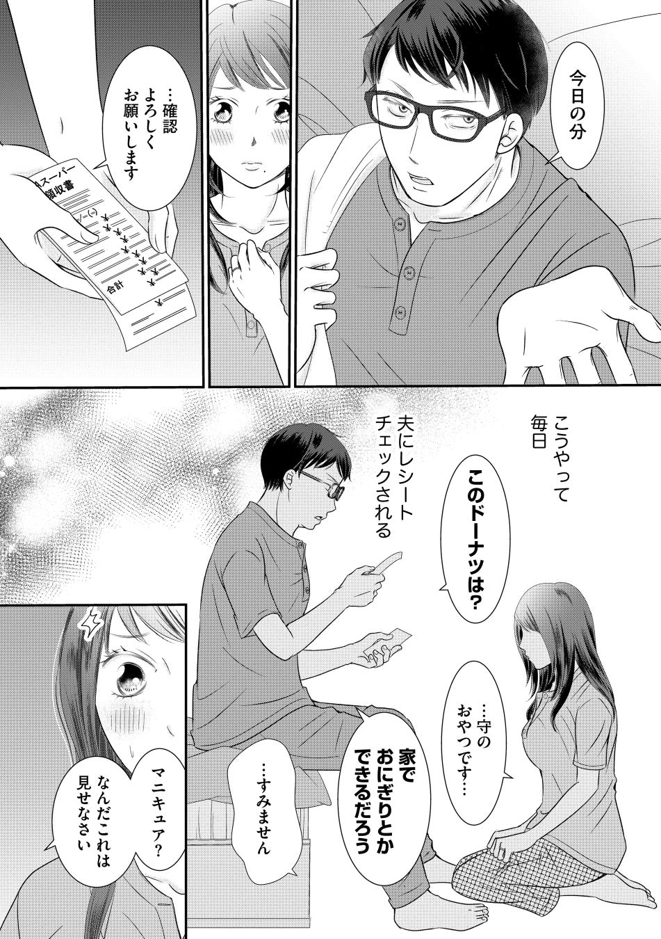 それでも律儀に毎日都度、買い物レシートを誠司に提出すれば、贅沢だとなじられる。「妻としての務めを果たせ」と、毎晩、寝室で一方的な奉仕を強いられる。
