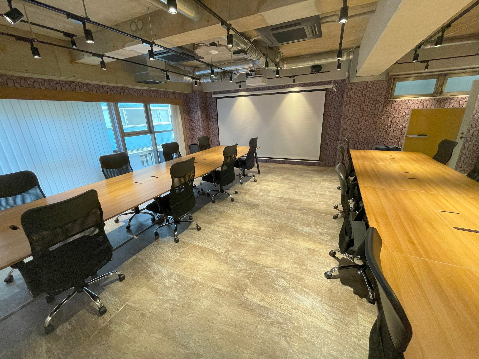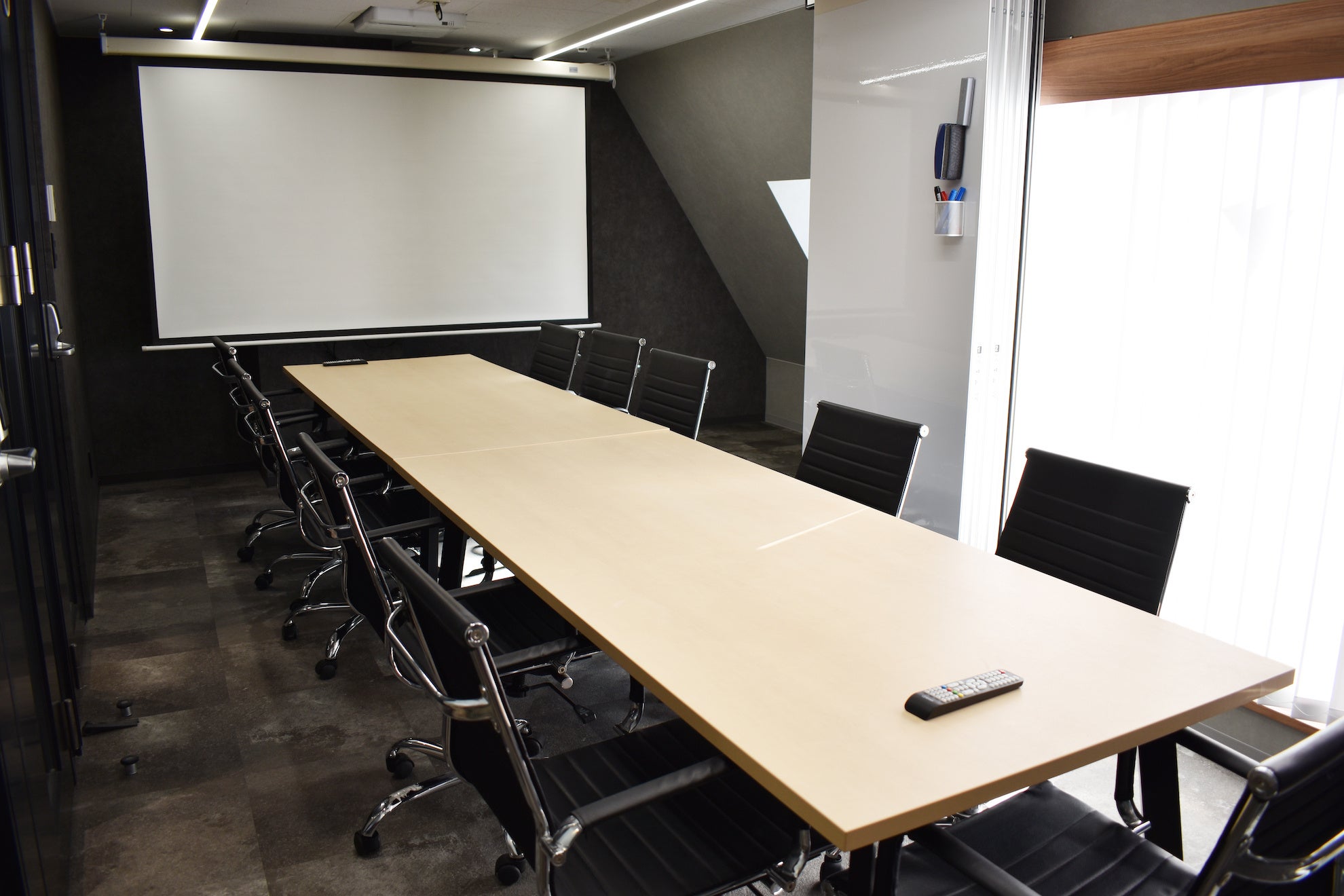 【5F会議室・喫煙スペースフロア】の会議室にはディスプレイ・プロジェクターに加え、オンライン会議に使いたいマイク・スピーカーも完備。用途に応じて2つの会議室を繋げ、最大12名まで利用可能。お気軽に、ご相談ください。