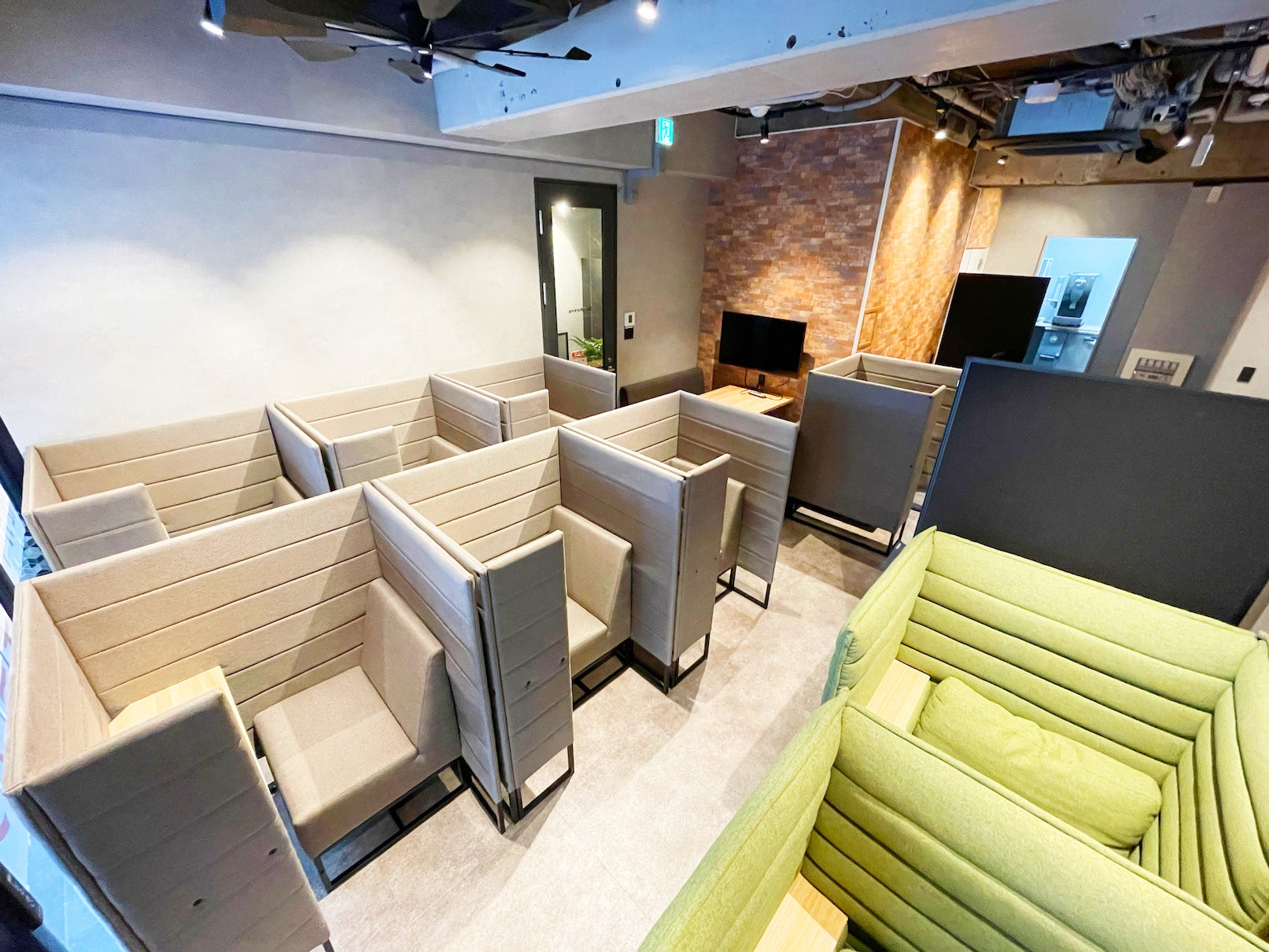半個室がある【1Fオフィスワークフロア】では背景を気にせずオンライン会議を快適に行えます。プライベートなスペースを保てるため、集中して仕事ができます。