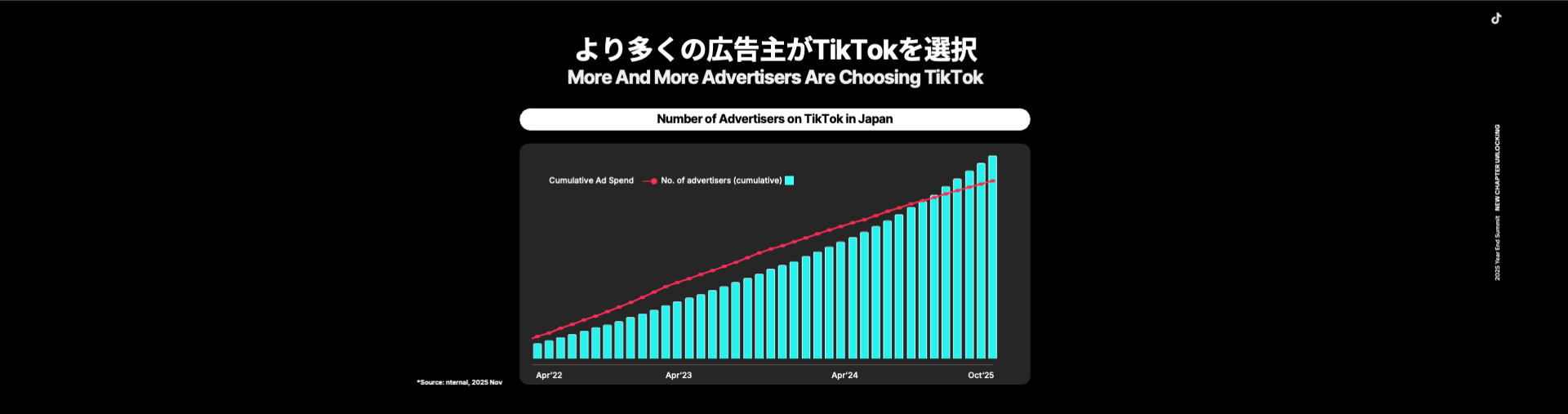 2025年は、本イベントのキーメッセージ「New Chapter Unlocking」が示すとおり、TikTokが日本のユーザーにとって日常的に利用されるプラットフォームとなるべく、ソリューションの提供やアップデートを進め、ユーザー・企業・クリエイターがそれぞれの目的を達成できる“新章”が本格的に始動した一年となりました。