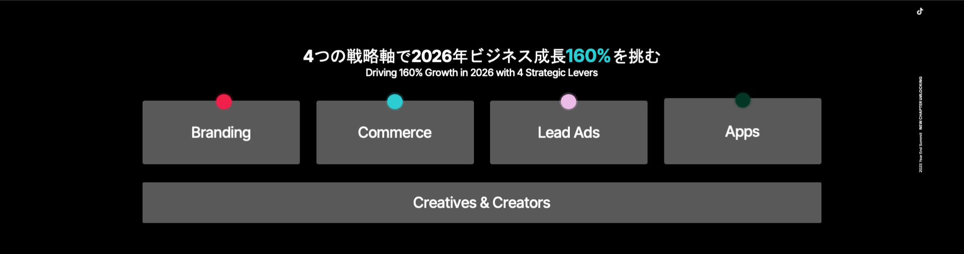 2026年に向けて、TikTok for Businessは、ブランディング、リード獲得、アプリ、eコマースの4つの戦略軸を中心に、クライアントのさらなるビジネス成長を支援する新たなソリューションを順次提供していきます。また、メジャーメント領域(効果測定)においては、データクリーンルームなどを活用した測定精度の向上にも取り組んでいきます。