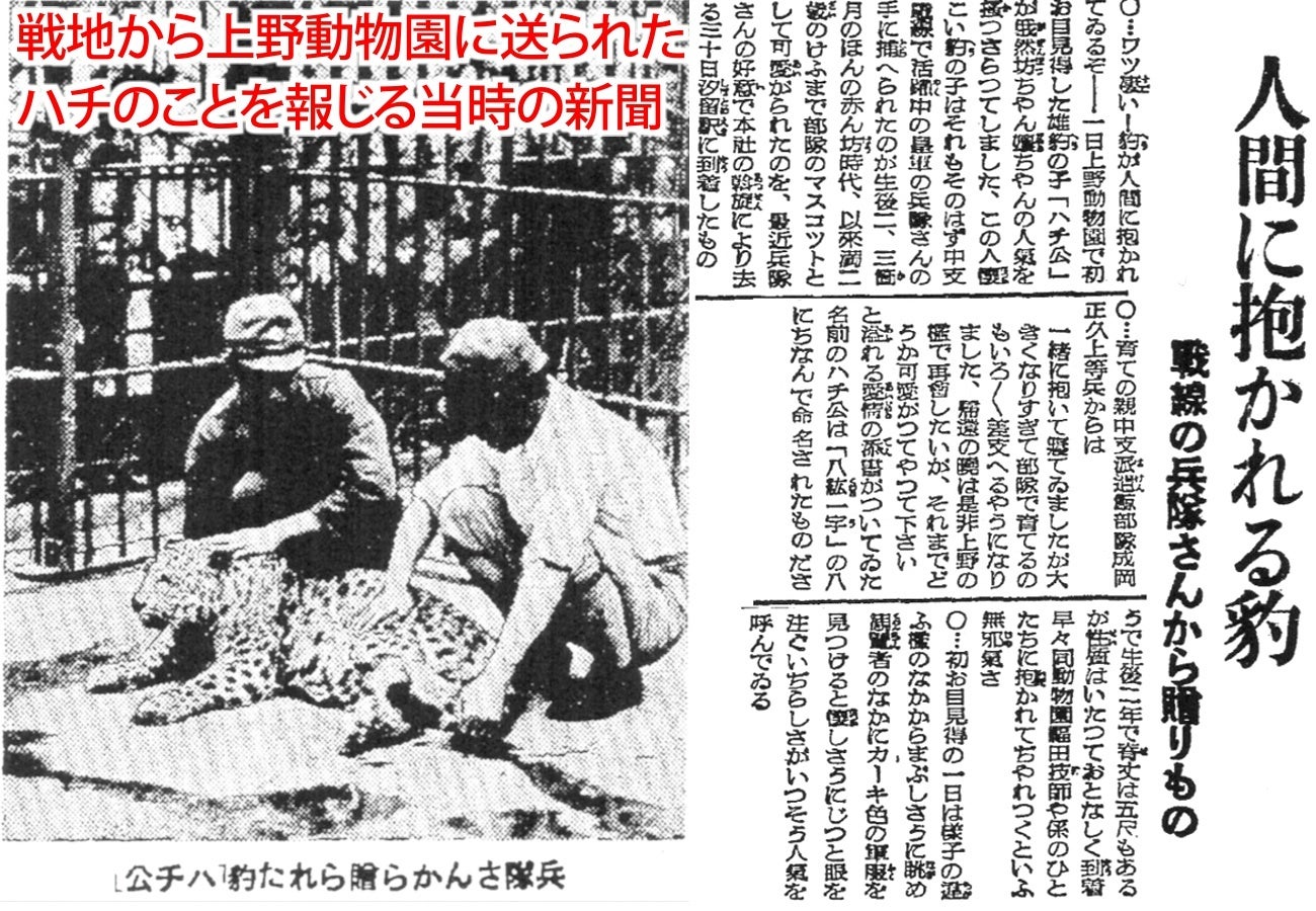 成岡さんの配属先の部隊は別名“くじら部隊”と呼ばれていた歩兵二三六連隊第八中隊の第三小隊。高知県は海が近く、くじらがいた海域なので、そう呼ばれていた。中国でのくじら部隊の任務は、「作戦」と「警備」の二つ。「作戦」は敵と戦い、相手を撃破して地域を占領することで、「警備」は占領した土地を放っておけば、また敵の手に渡ってしまうため、戦いながら死守をすることであった。中国に入り、各戦地を転々と移動していた昭和14(1939)年10月、“くじら部隊”の次の任務地は、中国の内陸地を流れる長江の中流域に位置する湖北省陽新県と大冶県の県境にある銅山『牛頭山』だった。くじら部隊は上海の埠頭から出発する輸送船に乗り込み、長江を約7日間かけて上り、牛頭山を目指した。1941年2月、成岡さんはそこで、一生の友ともいうべき、一匹の動物と出会うことになる。中国の農民から、人間を襲うヒョウを退治してほしいと頼まれた成岡さんは、部下を連れて牛頭山に出向いた。ヒョウの巣穴を煙でいぶりだすと、親ヒョウは逃げ、子ヒョウだけが残された。その時に保護されたのが、後に「ハチ」と名付けられる子ヒョウ。この小さな天使は、成岡さんと生活を共にし、隊員たちからも可愛がられた。隊員たちにとって子ヒョウは優しい気持ちにさせてくれる欠かせない存在になっていく。
