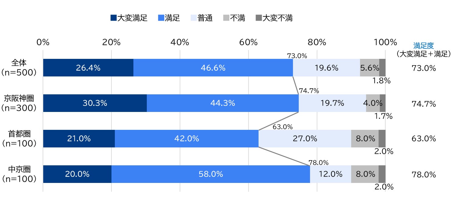 「大変満足」の割合をみると、京阪神圏で30.3%と最も高いのに対し、首都圏では21.0%、中京圏では20.0%で、10pt程度差がある。