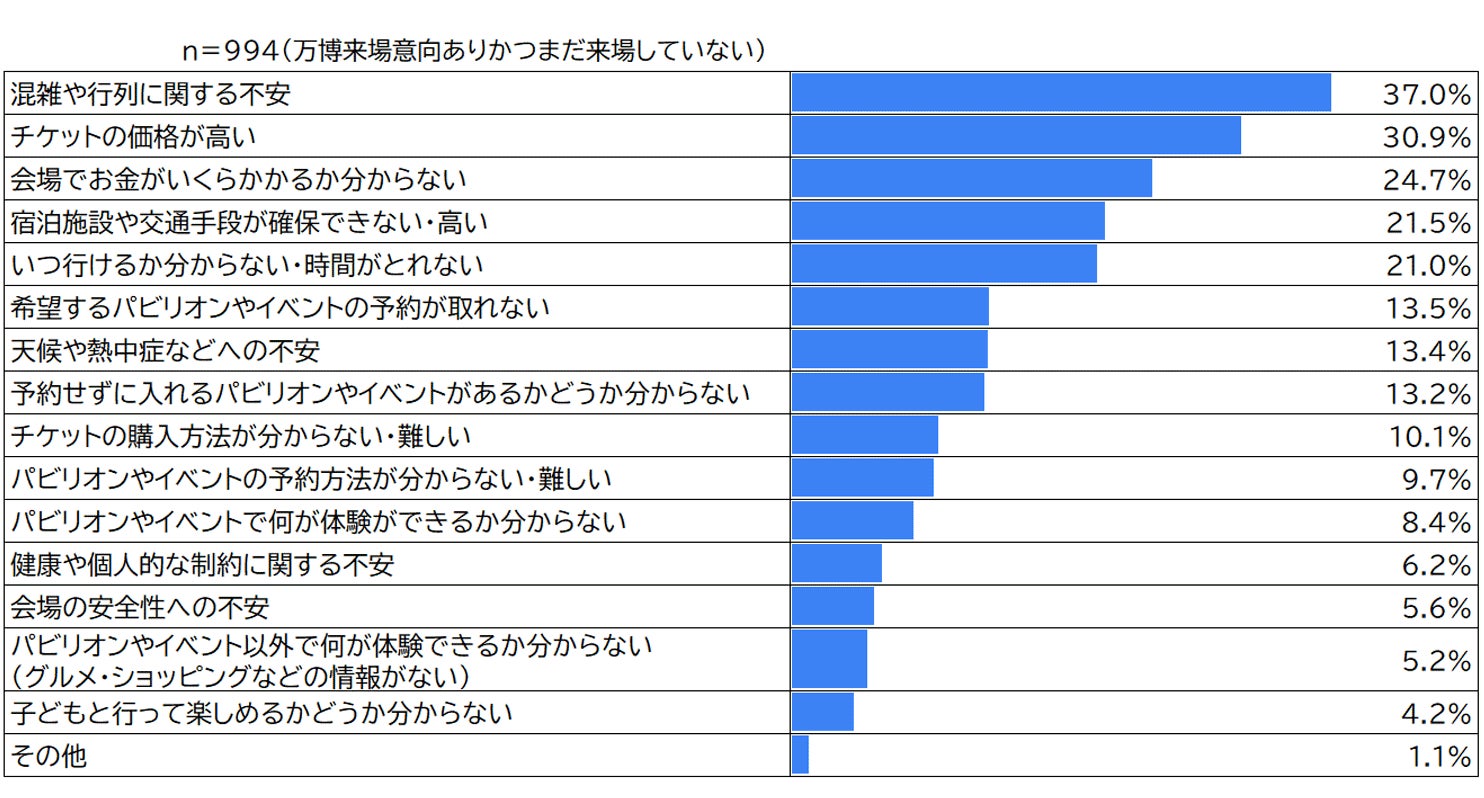 来場意向があるもののまだ来場していない層に対し、来場の障壁となっていること(上位3つ)について尋ねると、「混雑や行列に関する不安」や「チケットの価格が高い」「会場でお金がいくらかかるか分からない」が上位となった。