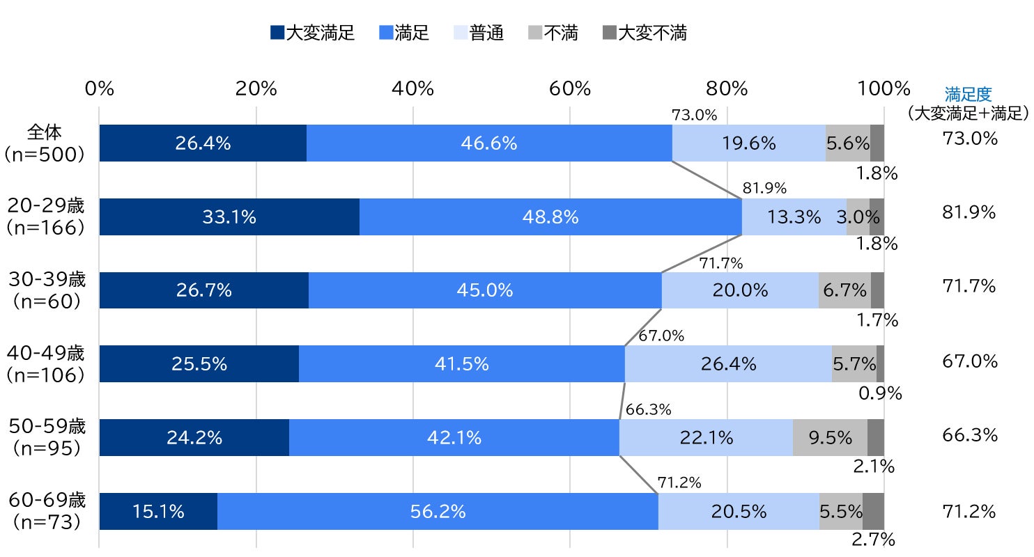 年代別でみると、20-29歳では、 「大変満足」+「満足」 は81.9%、「大変満足」は33.1%と他の年代と比べ最も高い。また、若年層ほど「大変満足」の割合が大きい。
