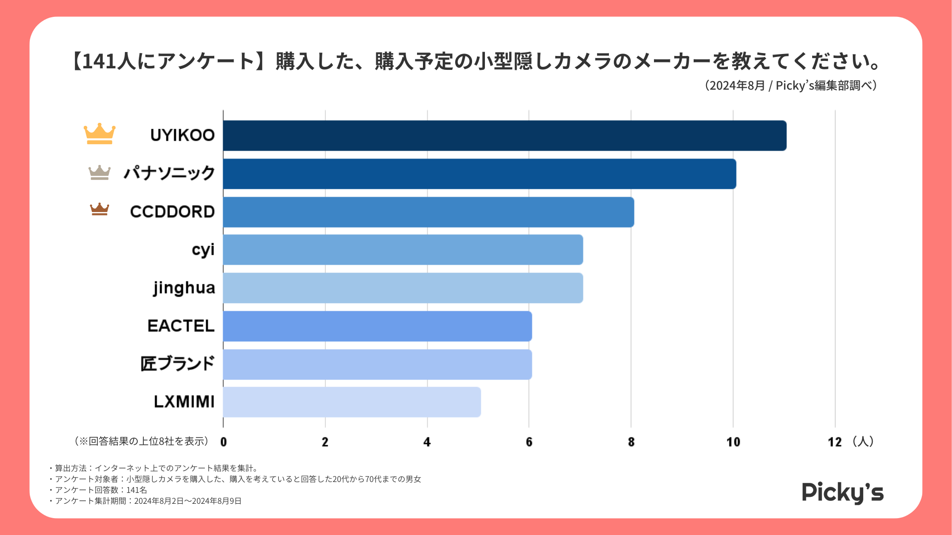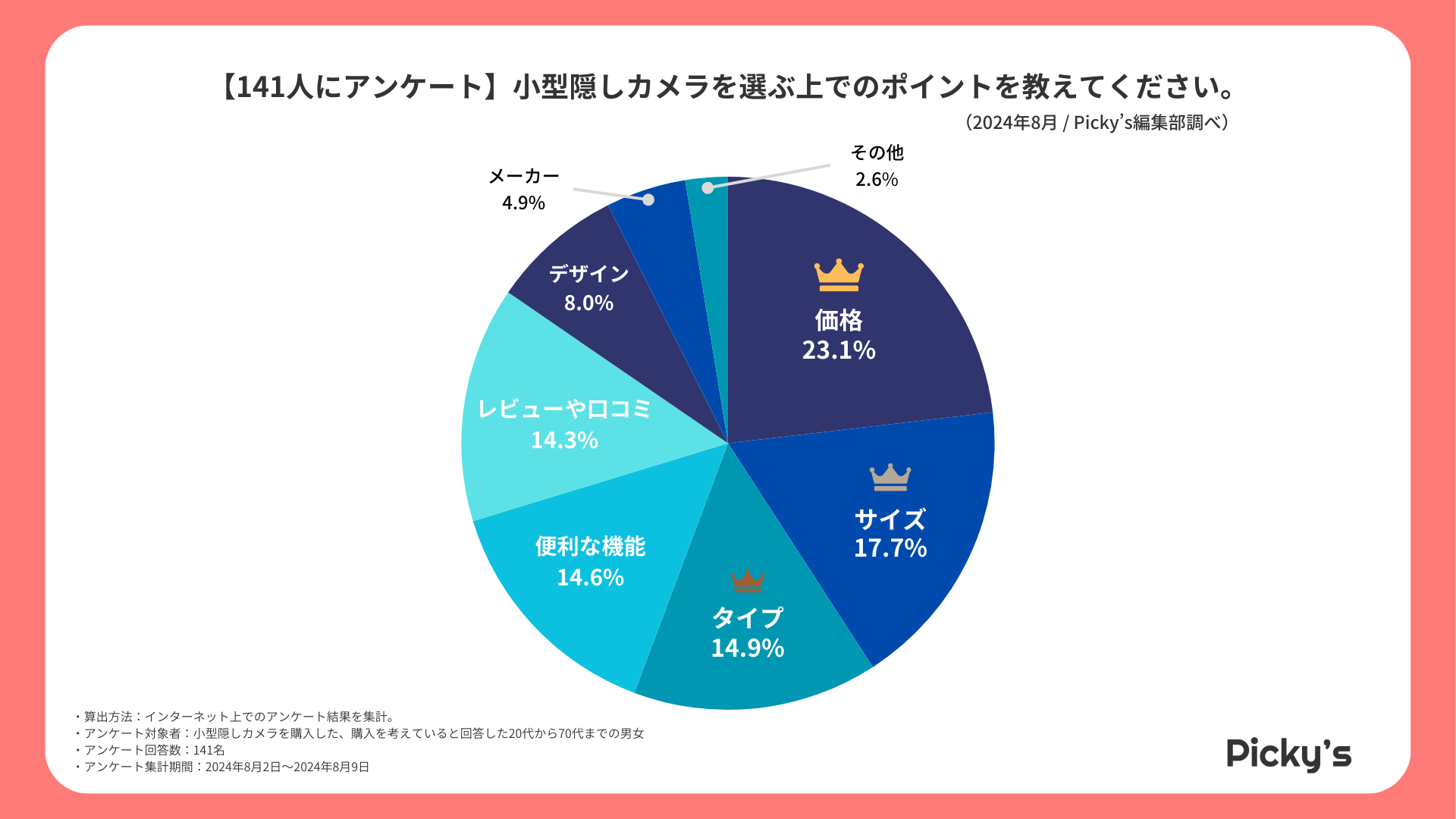 「Picky’s」は、インターネットショッピングにおいて、購入前に試せない・選ぶべきものがわからないという課題の解決を目標に、あらゆる商品のおすすめランキングや検証レビューを紹介するサイトです。このたびPicky’s(https://rentry.jp/)では、小型隠しカメラについてインターネット上でアンケート調査を行いましたので発表いたします。