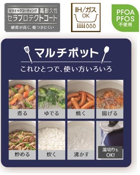 「セラプロテクトコート」は、高い硬度で傷つきにくく、耐久性が高いコーティングで、製品を長く使うことができます。さらに、製品の内面が白く、食材の焼き加減や色を見ながら、調理することができます。マルチポットに付属のフタは、穴付きで簡単に湯切りできるほか、フタのハンドルは折りたためるようになっており、コンパクトに収納できます。