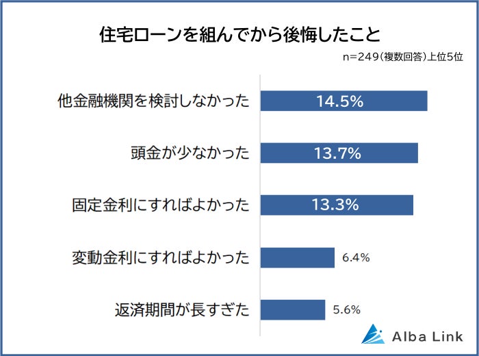 住宅ローンを組んでから後悔したこととしてもっとも多かった回答は「他金融機関を検討しなかった(14.5%)」でした。僅差で、2位「頭金が少なかった(13.7%)」、3位「固定金利にすればよかった(13.3%)」が続きます。