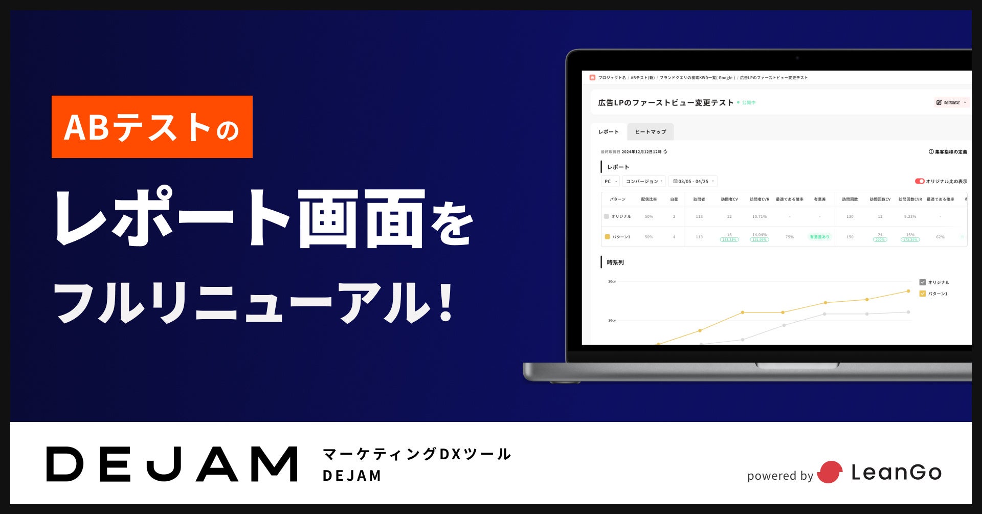 株式会社LeanGo (本社:東京都目黒区、代表取締役:平井 翔吏、以下 弊社) は、自社の運営するマーケティングDXツール「DEJAM( https://leango.co.jp/dejam/ )」がABテストのレポート画面をフルリニューアルしたことをお知らせいたします。