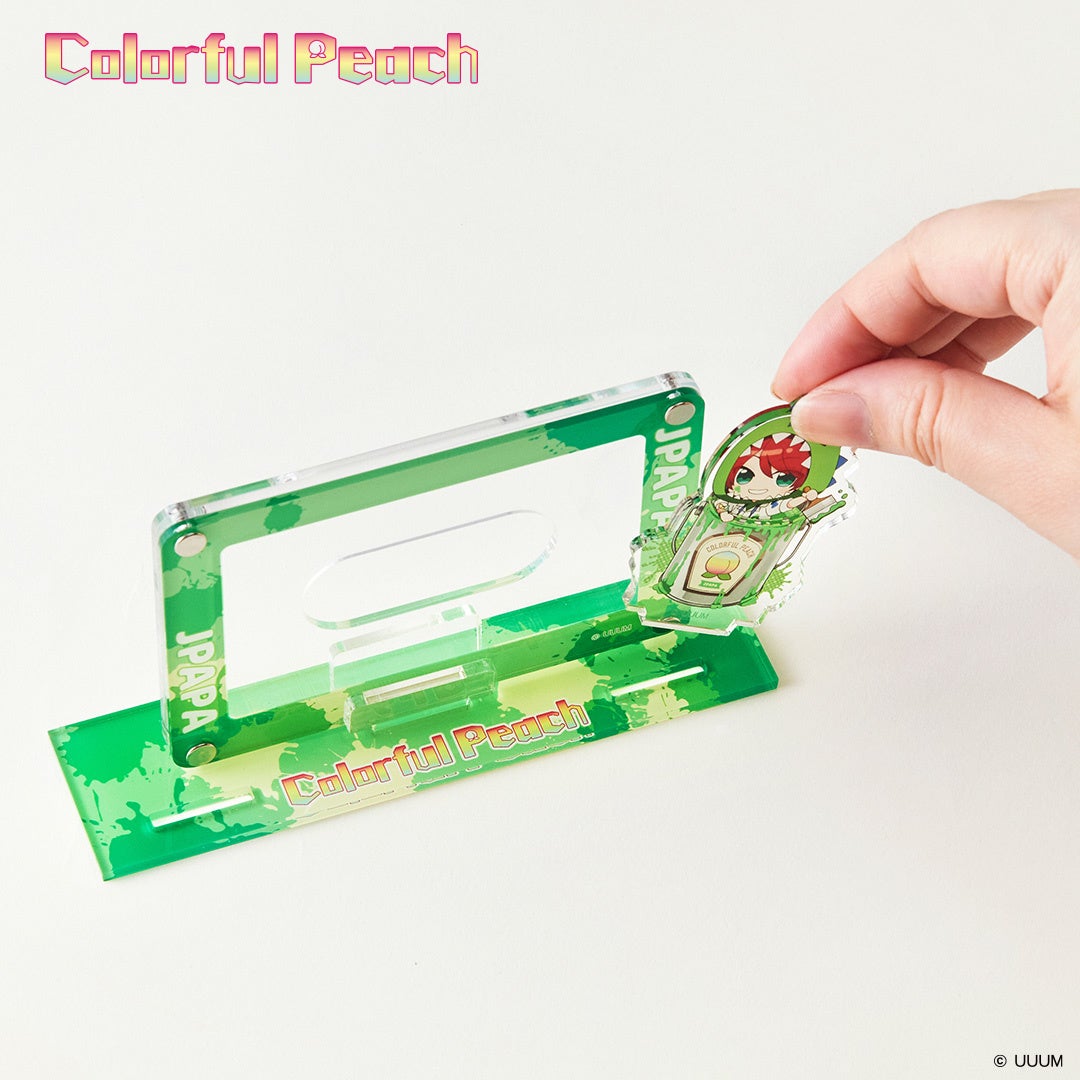 クリエイターカラーのもも缶に入った描き下ろしのミニイラストのアクスタと一緒にTカードを飾れるカードスタンド。カードケースはサイズが合えばお手持ちのトレーディングカードなども収納できます。また、横はもちろん縦にも立てることができます。アクスタも差し込み口のサイズが合えばお手持ちのアクスタを自由に差し込むことが可能。カスタマイズして自分だけのオリジナルスタンドが作れます。