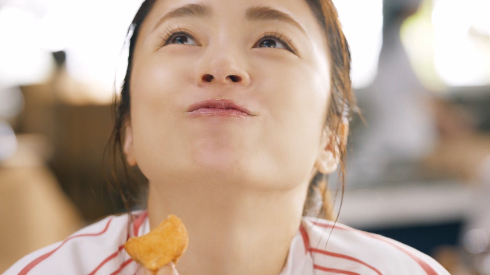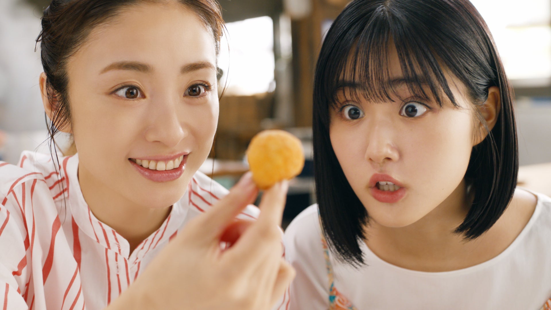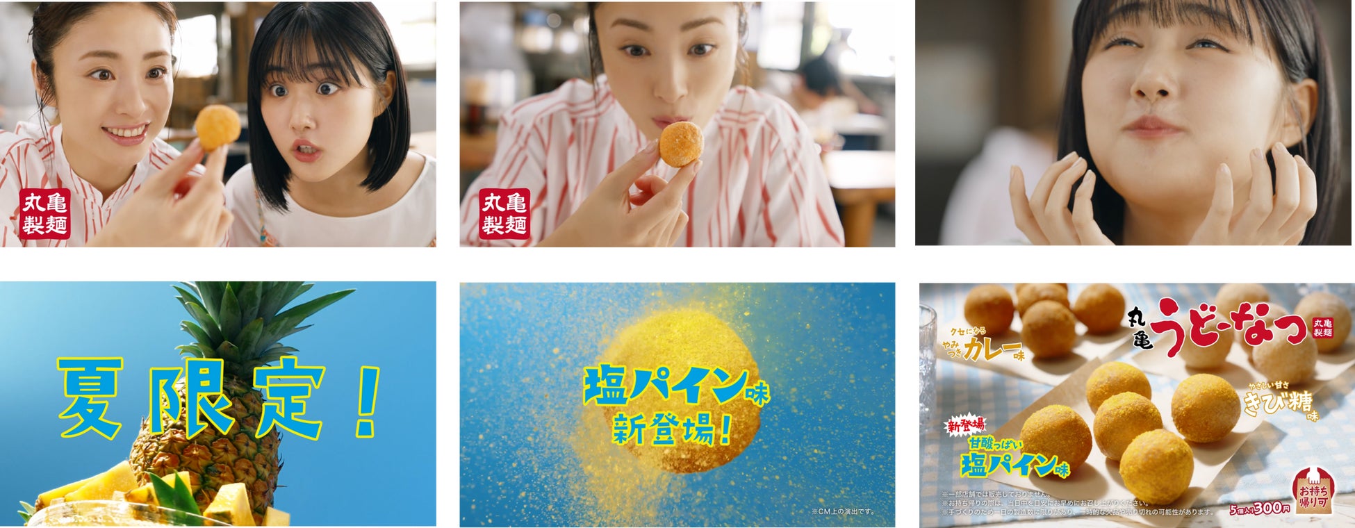 今回のTVCMは、丸亀製麺の店舗を再現したスタジオで、上戸さんと原さんが「丸亀製麺のうどーなつ!?」と声を揃え「丸亀うどーなつ」をじっくり見つめるシーンから始まります。その後「夏限定、『塩パイン味』新登場!」という上戸さんのナレーションとともに、今回新たに登場する「塩パイン味」をイメージしたパイナップルの映像が映し出されます。上戸さんと原さんは「丸亀うどーなつ」をひと口頬張り、そのもっちもちな食感と口いっぱいに広がる甘酸っぱい味わいに「夏も、もっちもちが、止まりません!」と思わず至福の表情を浮かべます。そして、上戸さんの「丸亀うどーなつは3つの味だよ!」というナレーションとともに、夏限定の『塩パイン味』と、好評販売中のやさしい甘さの『きび糖味』、クセになる『やみつきカレー味』の3種が映し出されます。最後に「丸亀うどーなつ」を両手に楽しげな雰囲気の上戸さんと原さんの様子で本TVCMは締めくくります。