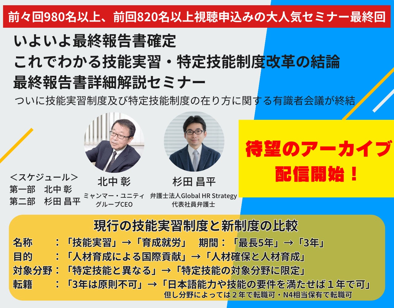 ミャンマー政府認定圧倒的No.1人材送り出し機関「ミャンマー・ユニティ」は、12月13日(水)に開催した「技能実習・特定技能制度改革の結論・最終報告書詳細解説セミナー」の動画を無料公開いたします。