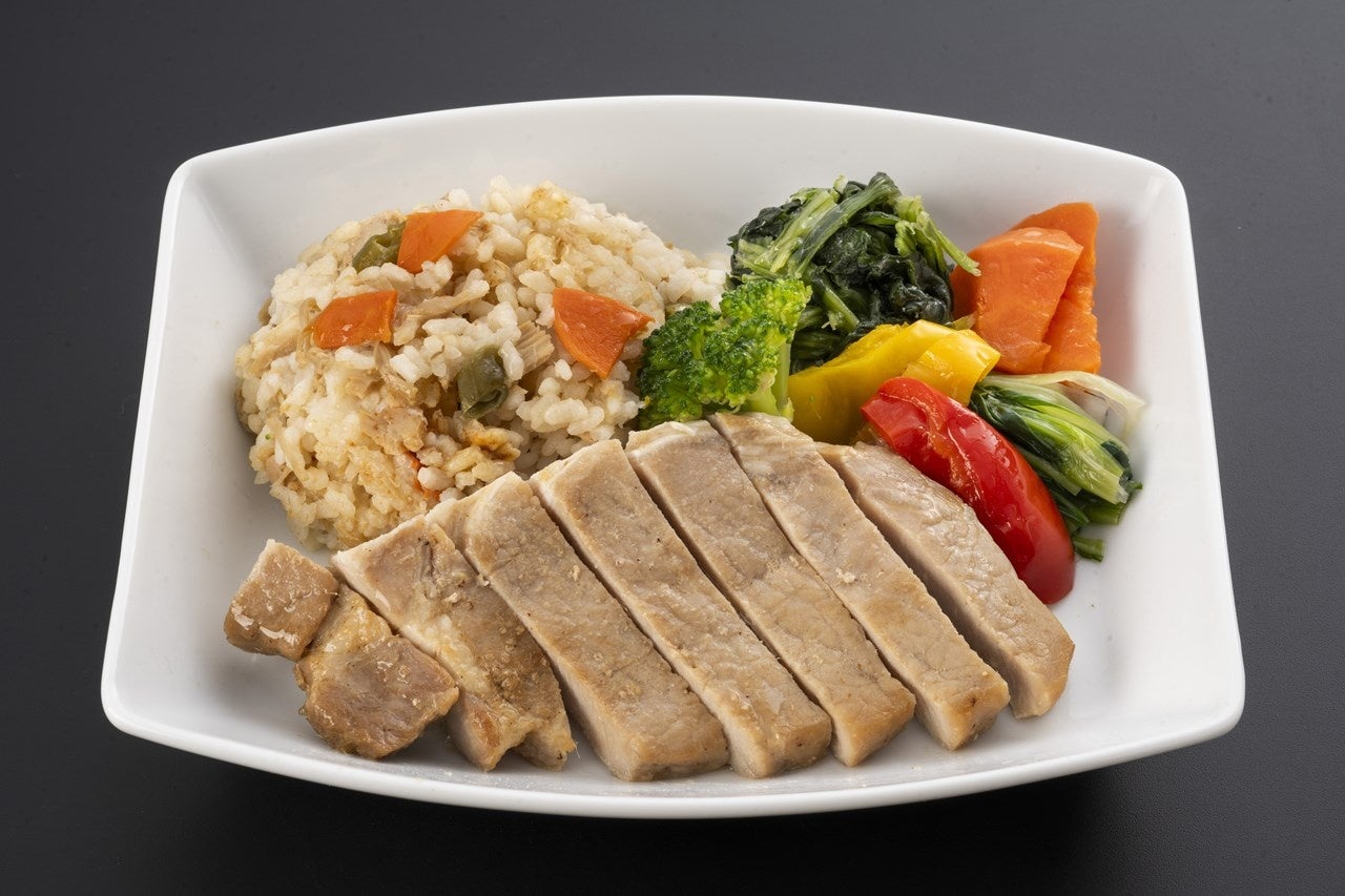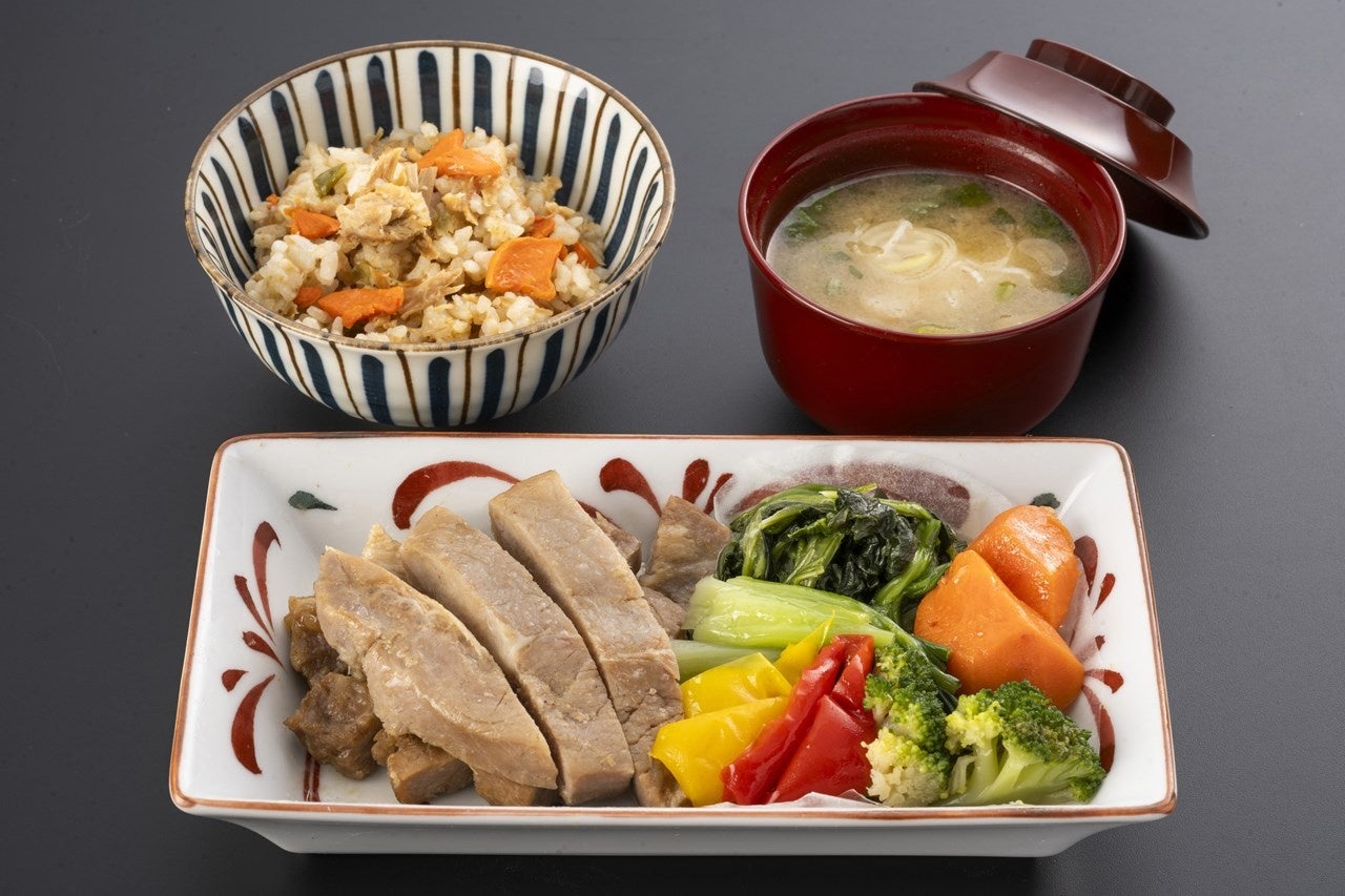 このメニューは、味の素㈱がパリ2024オリンピック柔道日本代表に内定している阿部 一二三選手(男子66kg級)、阿部 詩選手(女子52kg級)、髙市 未来選手(女子63kg級)へ減量後の回復食として提供している「勝ち飯®」を、機内食にアレンジしたものです。やわらか豚の生姜焼きには、ビタミンB1を多く含む豚肉を使用し、味付けは薄味ながらもうま味がきいており、食欲に関わらず栄養補給に適した一品です。羽田発パリ便では、味の素㈱の「ほんだし®」を使った「だし湯」も添えて提供します。