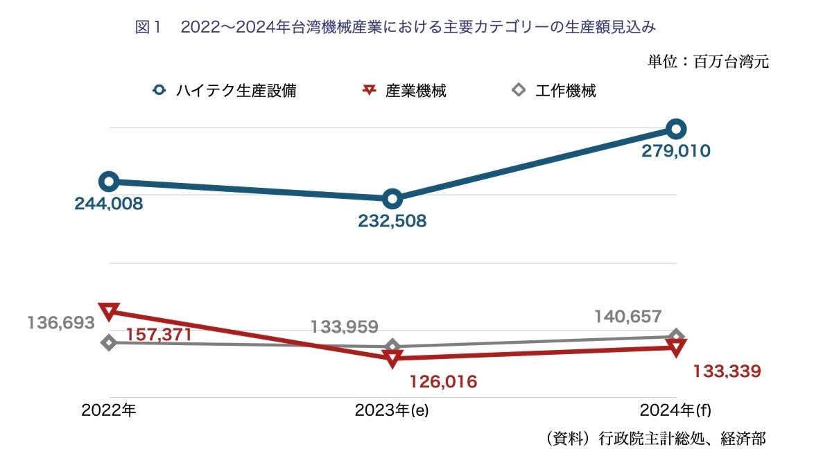 台湾機械産業の2023年第1四半期(1~3月)の生産額は2278億台湾元で、前期比19.9%減、前年同期比17.8%減だった。世界的なインフレによる末端需要の低迷、在庫圧力の増大で台湾内外のメーカーが設備投資に慎重になり、機械の需要が減少した。台湾当産業は輸出が中心だ。生産額の上位3カテゴリーは順に▽ハイテク生産設備、▽産業機械、▽工作機械であり、全体の45%以上を占めた。