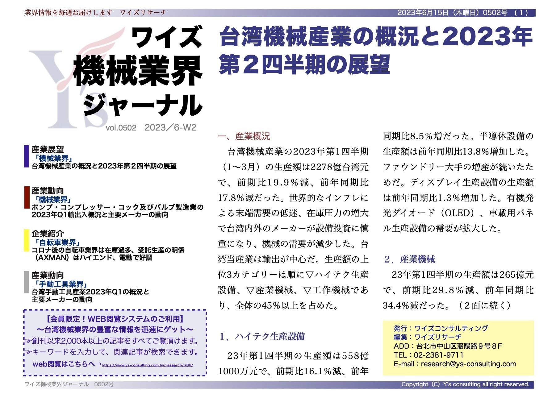 台湾機械産業の概況と2023年第2四半期の展望<ワイズ機械業界ジャーナル2023年6月第3週号発行>