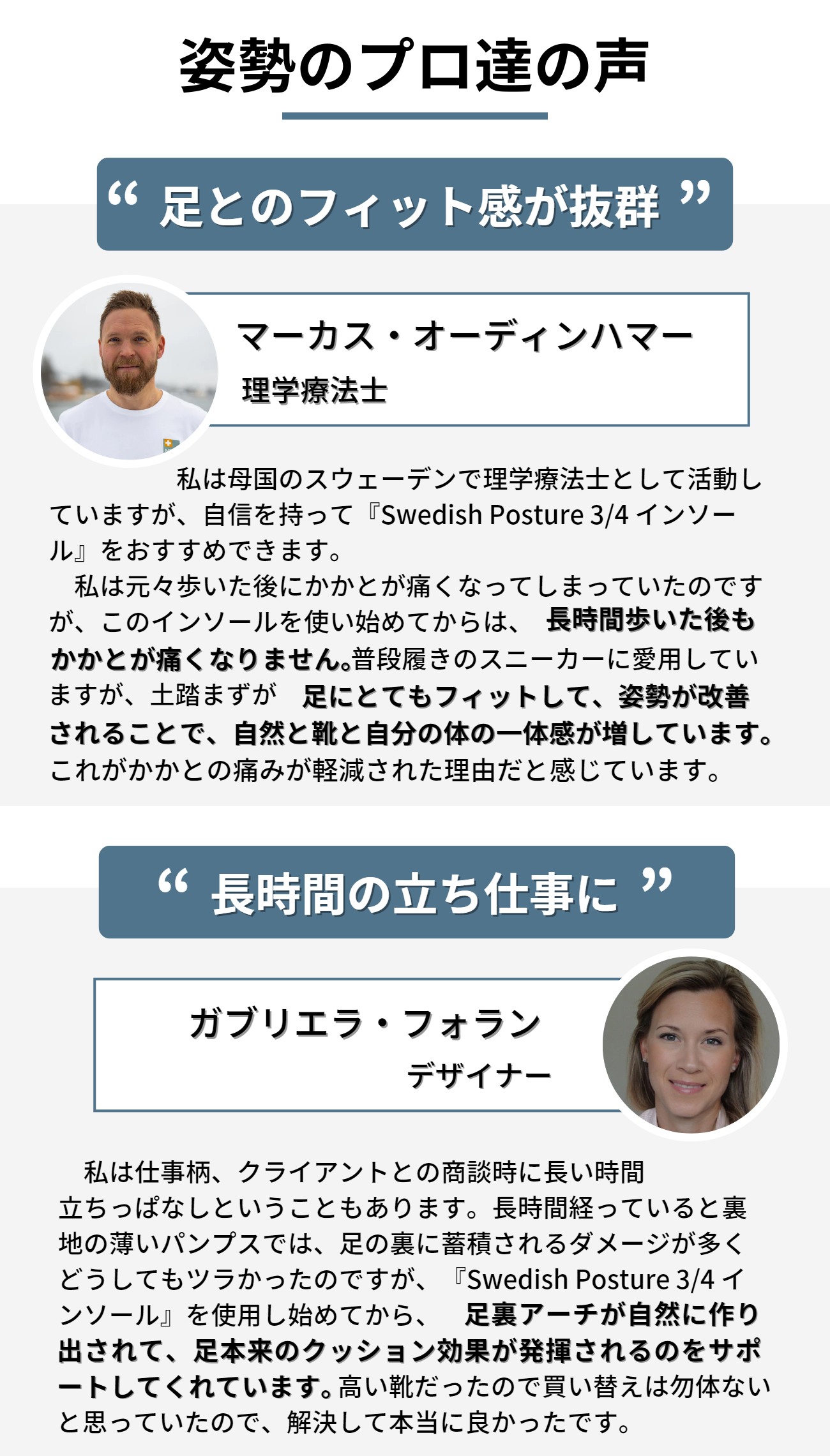 『Swedish Posture 3/4 インソール』の優れた機能とデザイン性から開発国のスウェーデンでは、理学療法士やトレーナーといった姿勢改善のプロから評価されています。