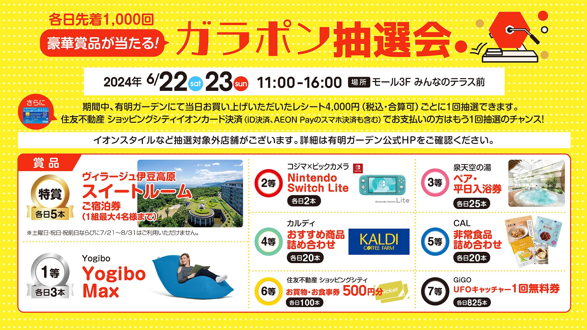 -参加方法:4,000円(税込)以上のお買い上げレシートごとに1回参加できます。住友不動産 ショッピングシティイオンカードで支払いをされたレシートについては、さらに1回抽選に参加できます。