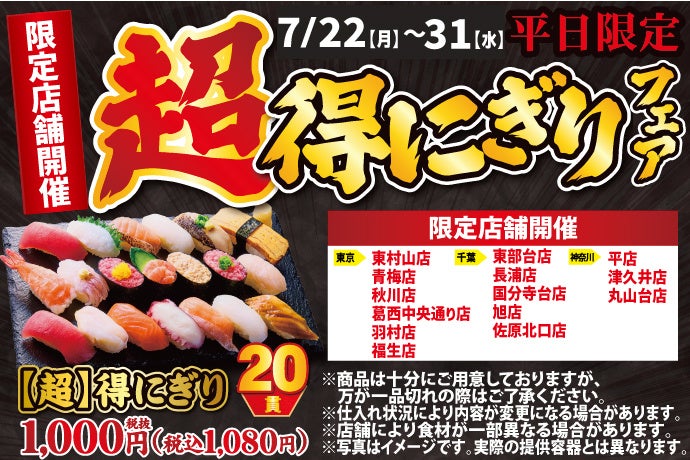 大人気企画が再登場!7月22日(月)~平日限定!『【超】得にぎりフェア』開催!(※限定店舗にて実施しております)