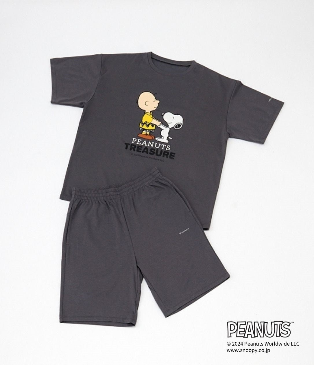 トップスは程良くワイドな身幅とドロップショルダーが開放感のあるシルエット。フロントにスヌーピーとチャーリー・ブラウンが描かれた「PEANUTS TRESURE」オリジナルデザインをプリント。半ラバープリントを採用することで、生地のしなやかさを活かして休養シーンの身体に寄り添う着心地を実現しました。