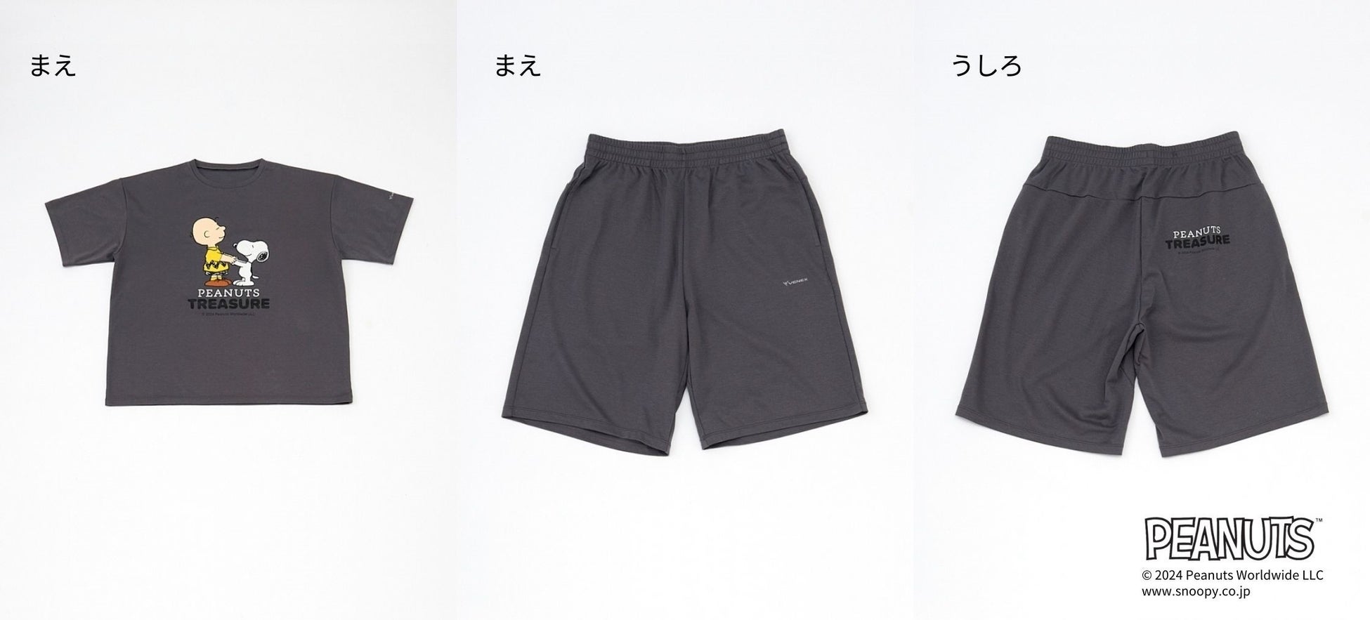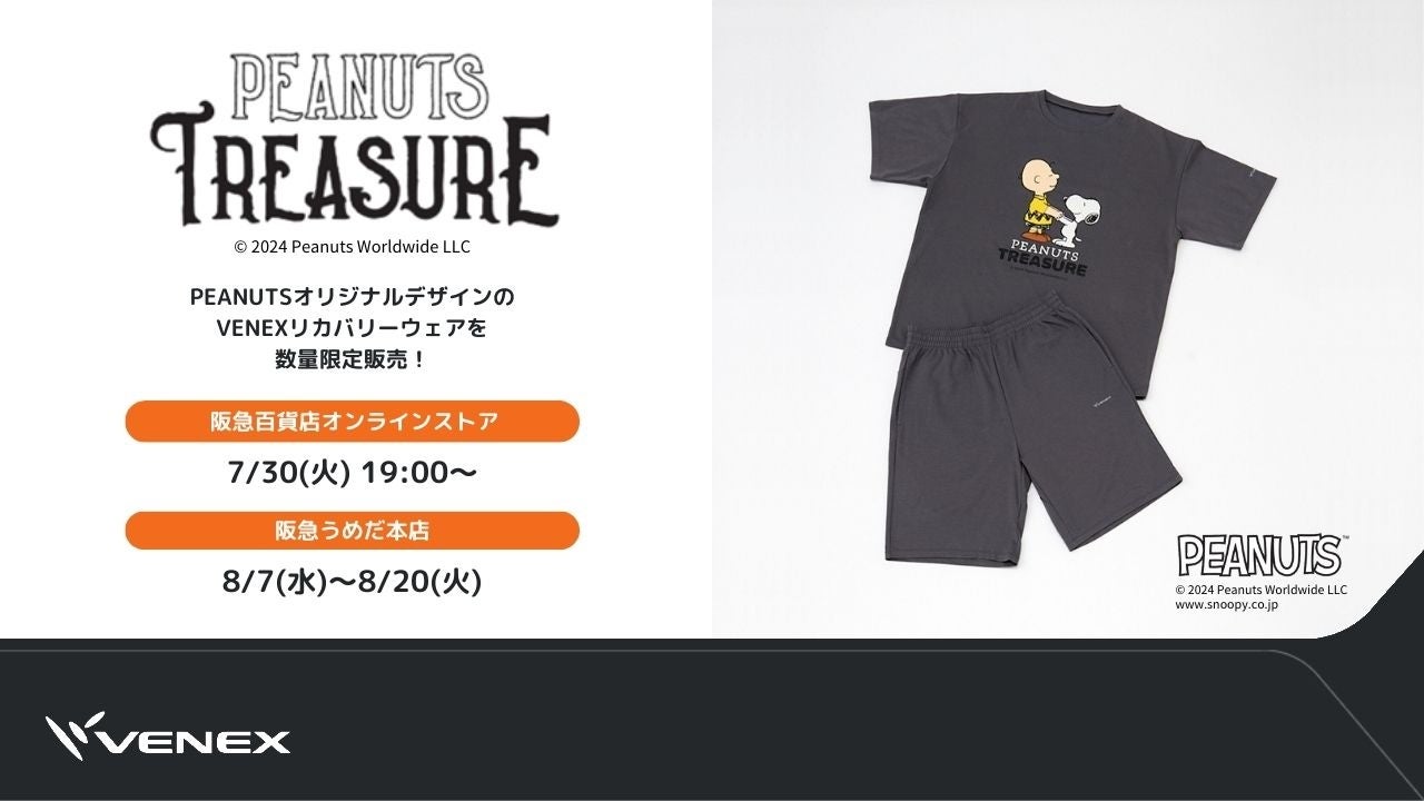 フェア開催期間中、阪急うめだ本店 7階 リビングフロアでは、ベネクスリカバリーウェアの『COMFORT PUNCH HALF SETUP(コンフォートポンチ リラックスシルエット ハーフセットアップ)』に「PEANUTS TRESURE」オリジナルデザインをあしらったアイテムを数量限定で発売します。また、阪急百貨店オンラインストアでは、2024年7月30日(火)19:00より先行発売します。