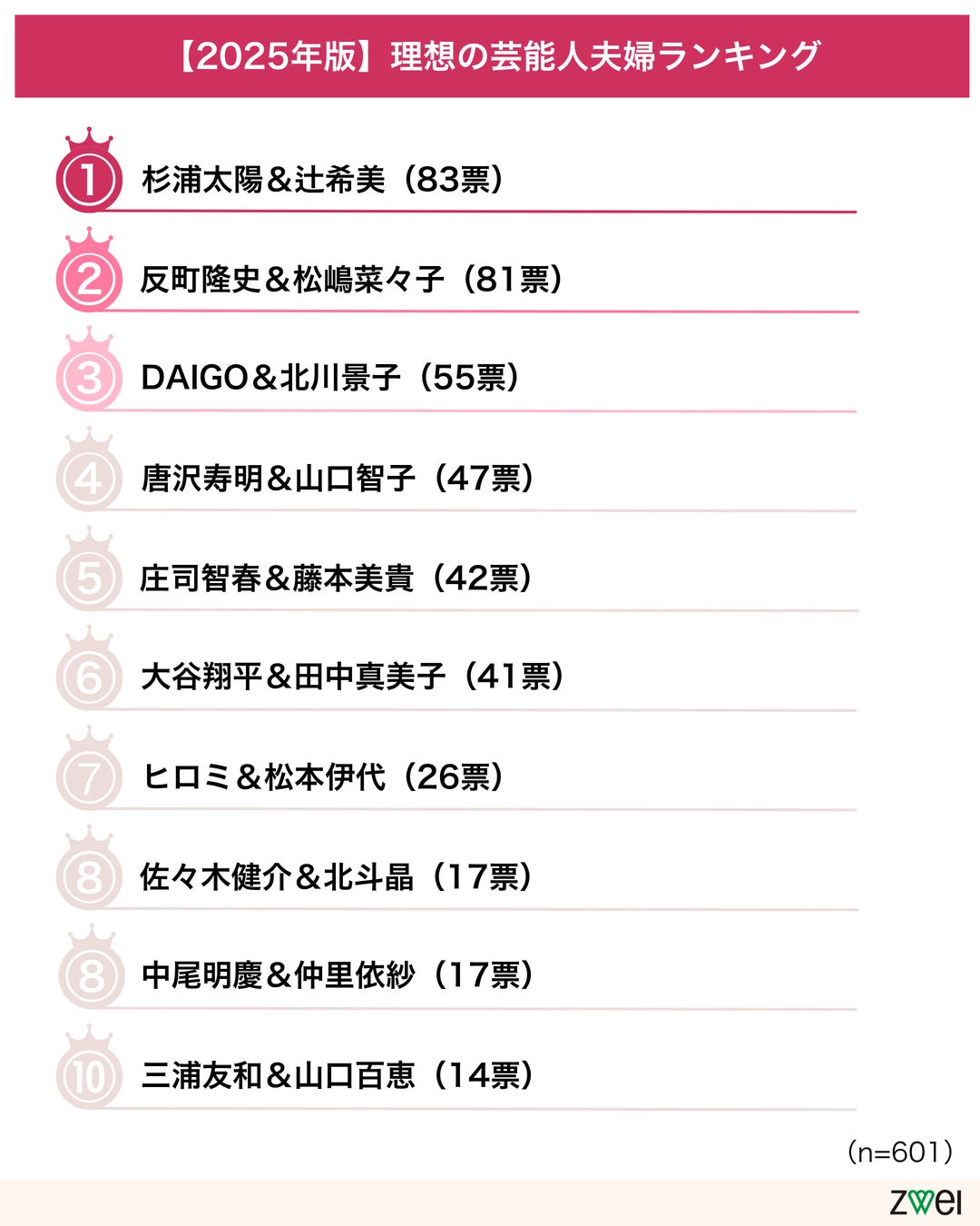 【2025年理想の芸能人夫婦ランキング】SNSの象徴 vs レジェンド。2票差のデッドヒートを制したのは?【結婚相談所ツヴァイ調査アンケート】