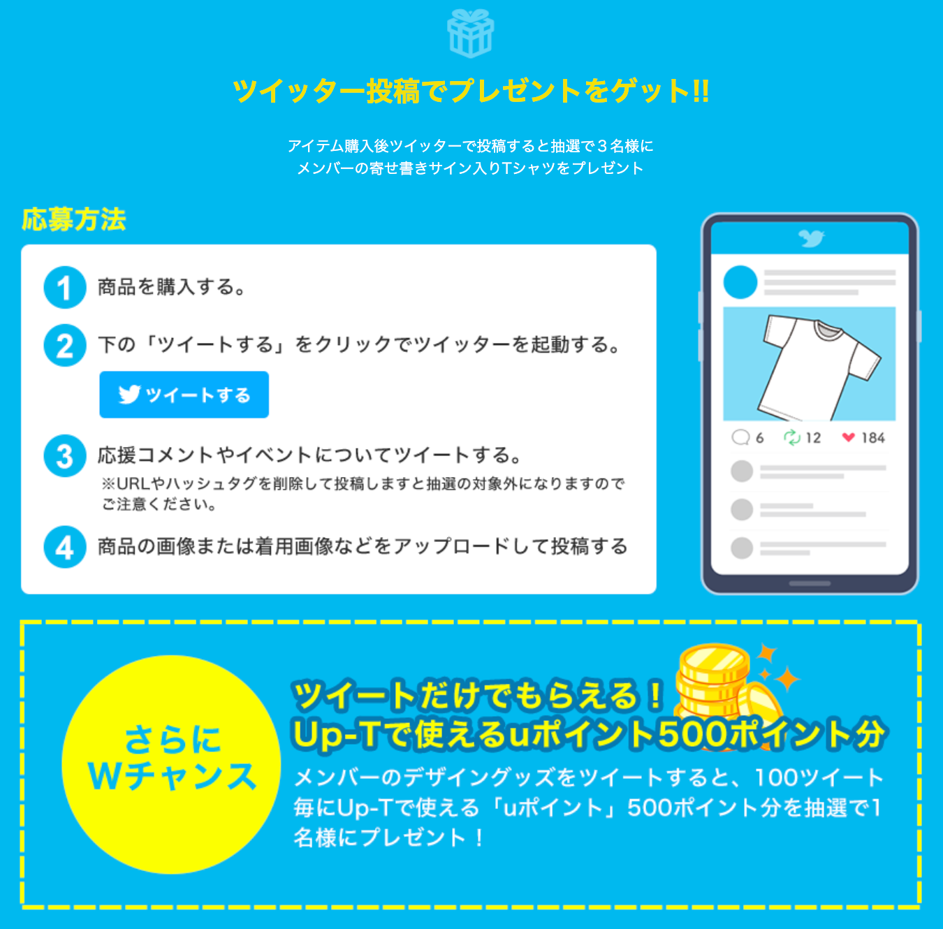 さらにダブルチャンスとして、合計ツイートが100投稿を迎えるごとに、抽選で1名様にUp-Tで使える「uポイント」500円分を付与します。