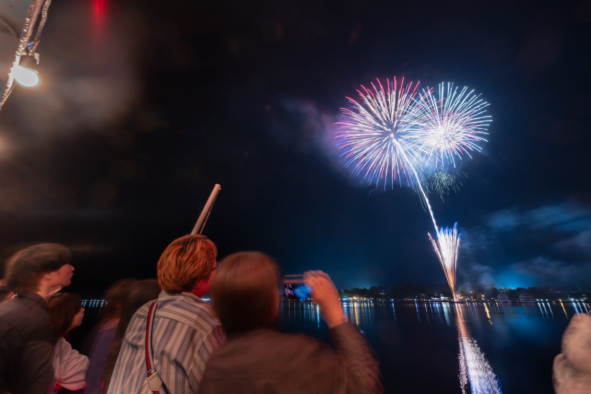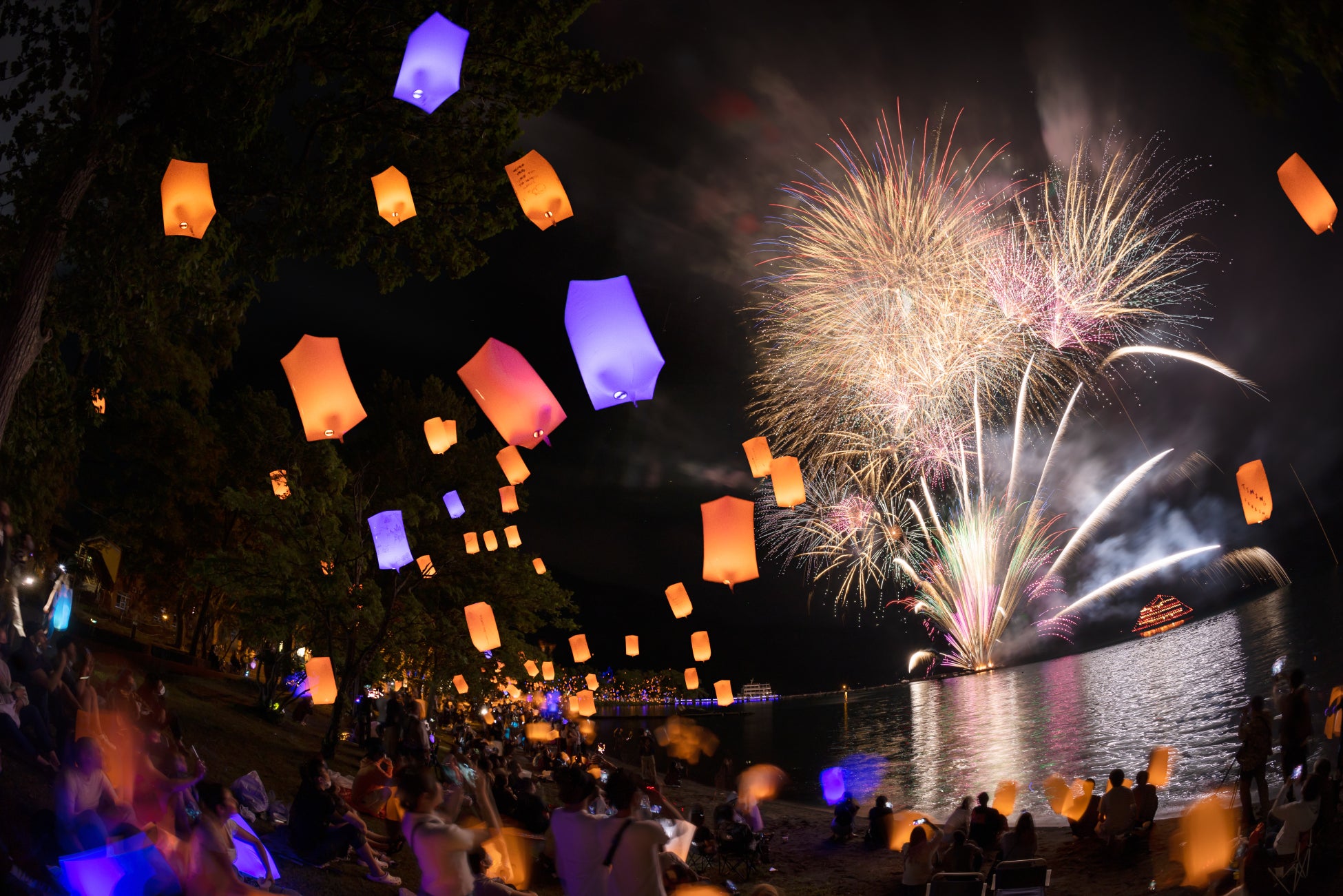自然豊かな十和田湖畔では空気が澄んでいて、人工の光も少なく、色鮮やかに咲く花火が魅力的です。桟橋を利用して観覧場所のすぐ近くから打ち上がる花火は、点々としたバルーンランタンの灯りを飛び越え、頭上に広がります。その迫力も別格です。