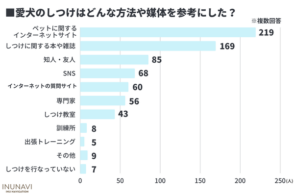 ・愛犬のしつけの参考は「ペットに関するインターネットサイト」が219人と最多。「SNS」68人や「インターネットの質問サイト」60人など、ネット関連の情報を参考にする飼い主が多い結果に。