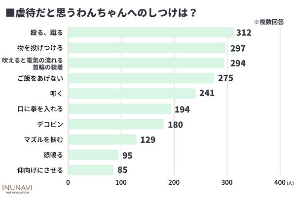 虐待だと思うわんちゃんへのしつけ行為は最も多い回答が「殴る・蹴る」312人でした。