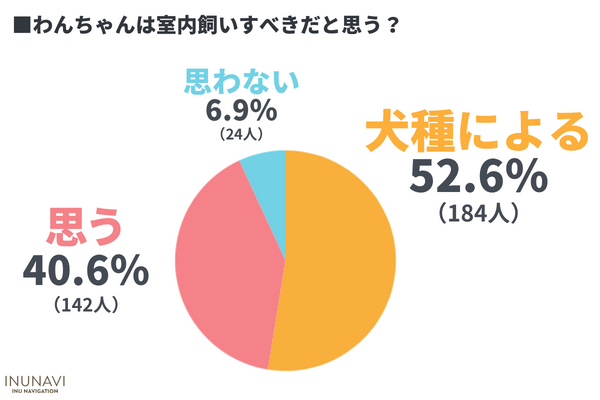 わんちゃんは室内飼いすべきだと思うかの質問で最も多い回答は「犬種による」52.6%でした。