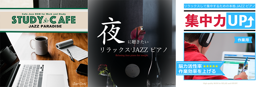 軽快なJAZZが集中力をアップさせる『STUDY CAFE -Cafe Jazz BGM for Work and Study-』、夜を彩る安らかなJAZZ ピアノで夜のリラックス時に最適な『夜に聴きたいリラックスJAZZピアノ』、脳力活性のために計算されたバランスの良い音色で心身をリラックスし、集中力が上がる至高のJAZZアルバム作品『リラックスして集中するのための本格 JAZZ ピアノ』の3作品は日々の様々なシーンのBGMとして最適です。