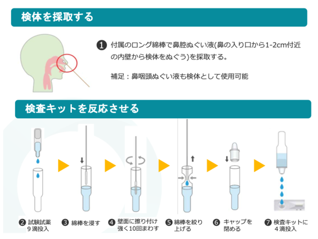 TBS「NEWS23」でも紹介された「鼻腔ぬぐい液(鼻の入り口から1-2cm付近内皮内壁をぬぐって採取))」等を用いて新型コロナウィルスの抗原を検出するキット!国内600社以上の導入実績有り。