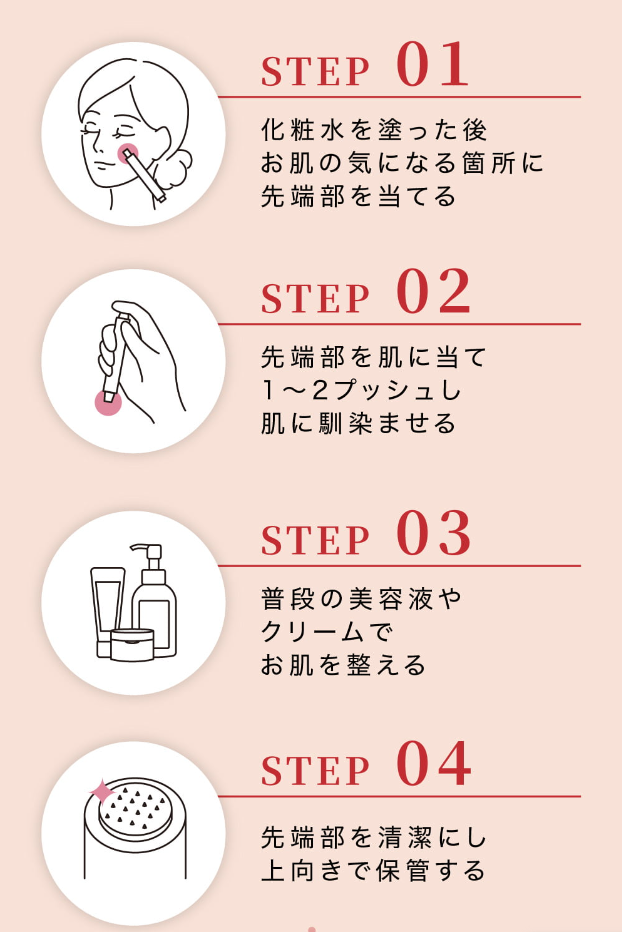 1.化粧水のあとキャップを外し、肌の気になる部分に当てます。 2.容器のノックボタンを1~2回ノックし、3秒保持します。 3.使用後は普段の乳液やクリームで肌を整えます。 4.使用後は先端部に付着した美容液をやさしく拭き取り、清潔に保ち、キャップを締めて保管します。 ※先端が下向きにならないように保管してください。