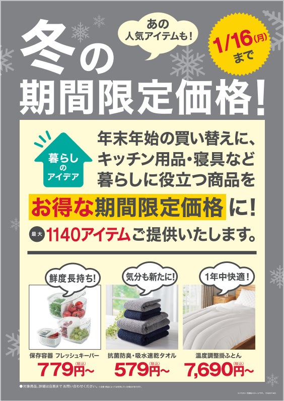 この度、12月16日(金)から1月16日(月)までの期間中、寒い冬や年末年始の時期にぜひ使っていただきたい、寝具やキッチン・バス用品など、暮らしに役立つ最大1140アイテムを「期間限定価格」にてご提供いたします。
